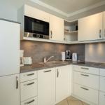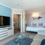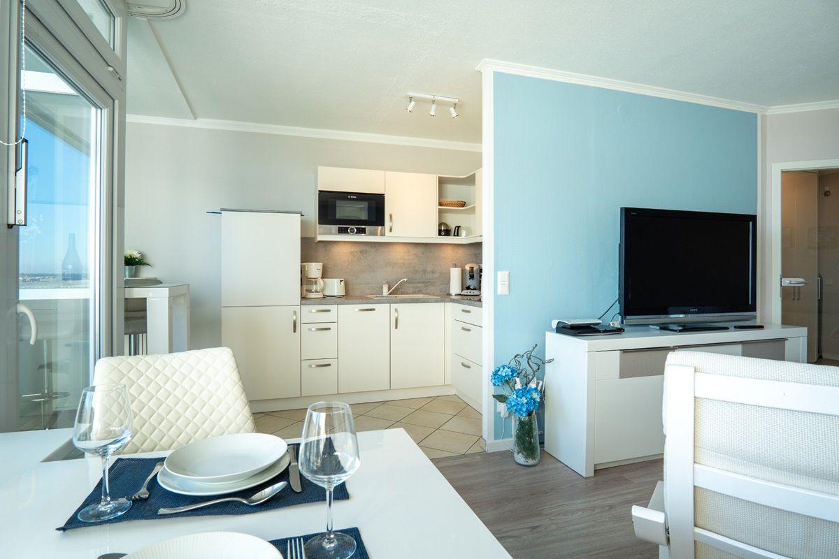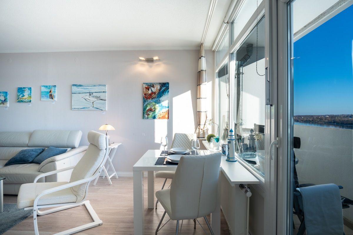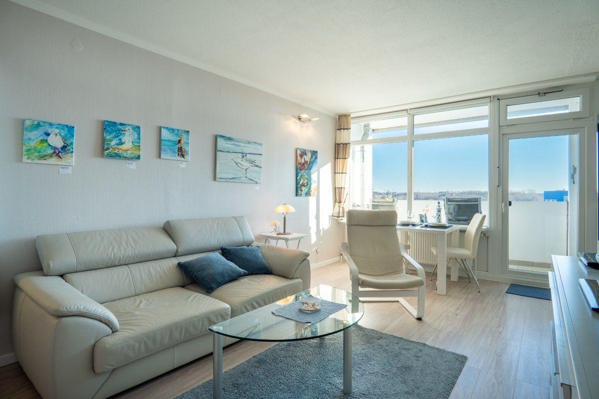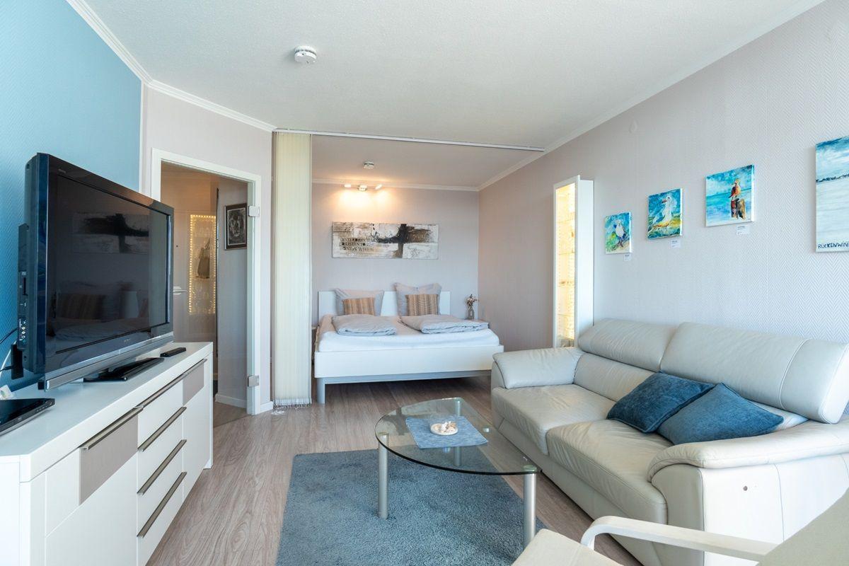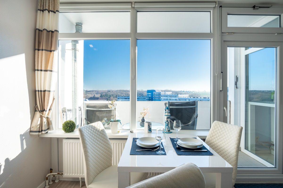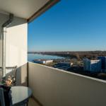 Die moderne Studiowohnung befindet sich in der zwölften Etage und verfügt auf ihren 45m² über einen sonnigen Wohn- und Schlafbereich mit einem TV-Bereich und Essecke im vorderen Bereich mit Zugang zum Südbalkon. Im hinteren Bereich befindet sich ein gemütliches Doppelbett (2 x 90 x 180cm). Die wohnung wurde für zwei Personen optimiert. Bei Bedarf findet eine dritte Person (für Kinder geeignet) bequem auf dem Schlafsofa Platz. Die offene Küchenzeile ist u.a. mit einem Geschirrspüler und einem Mikrowellen-Backofen-Kombigerät ausgestattet.
