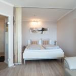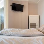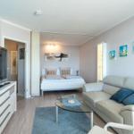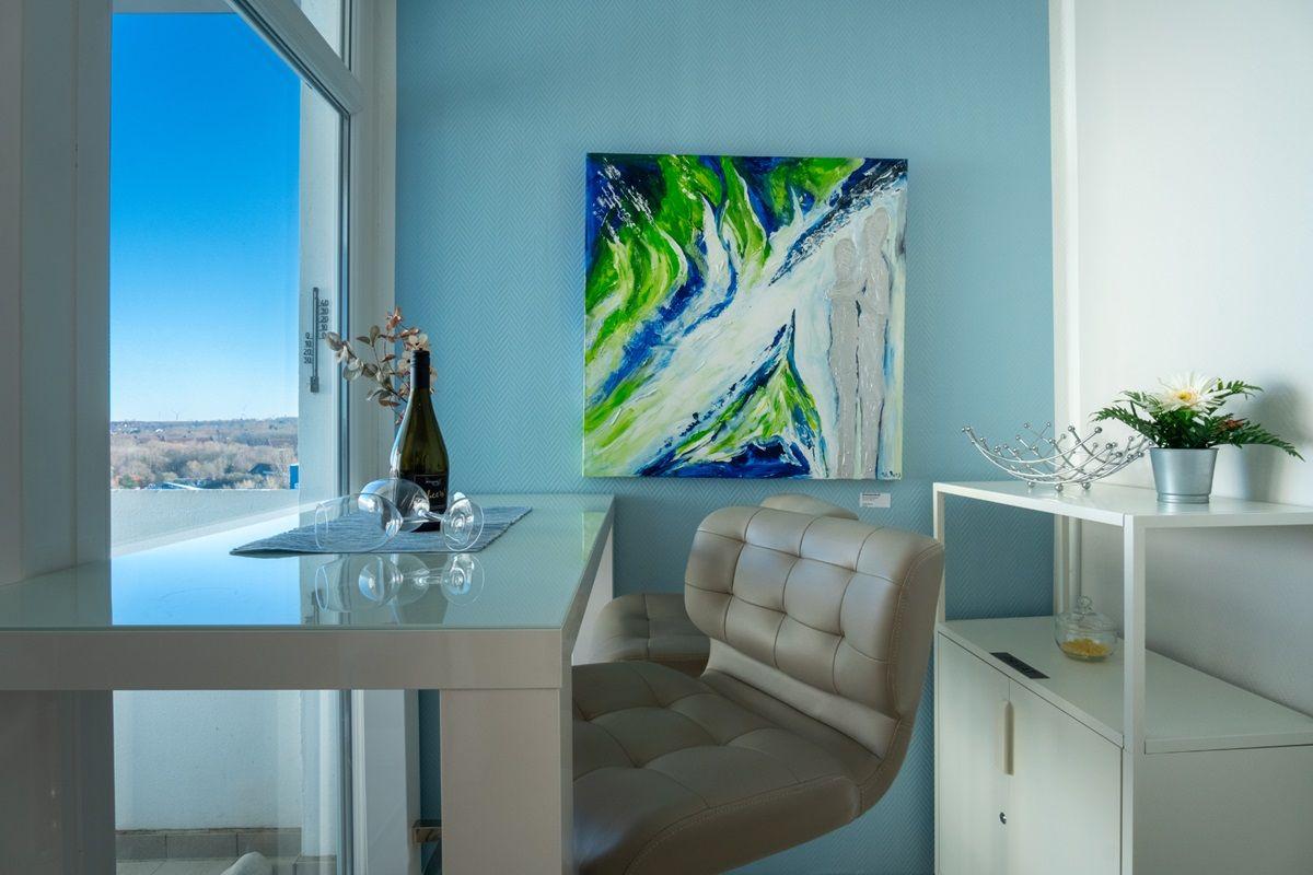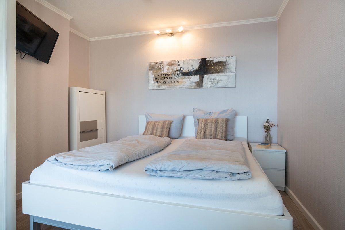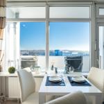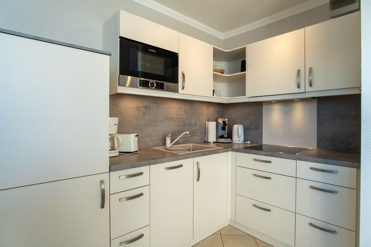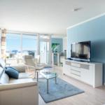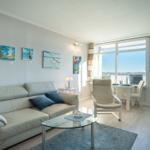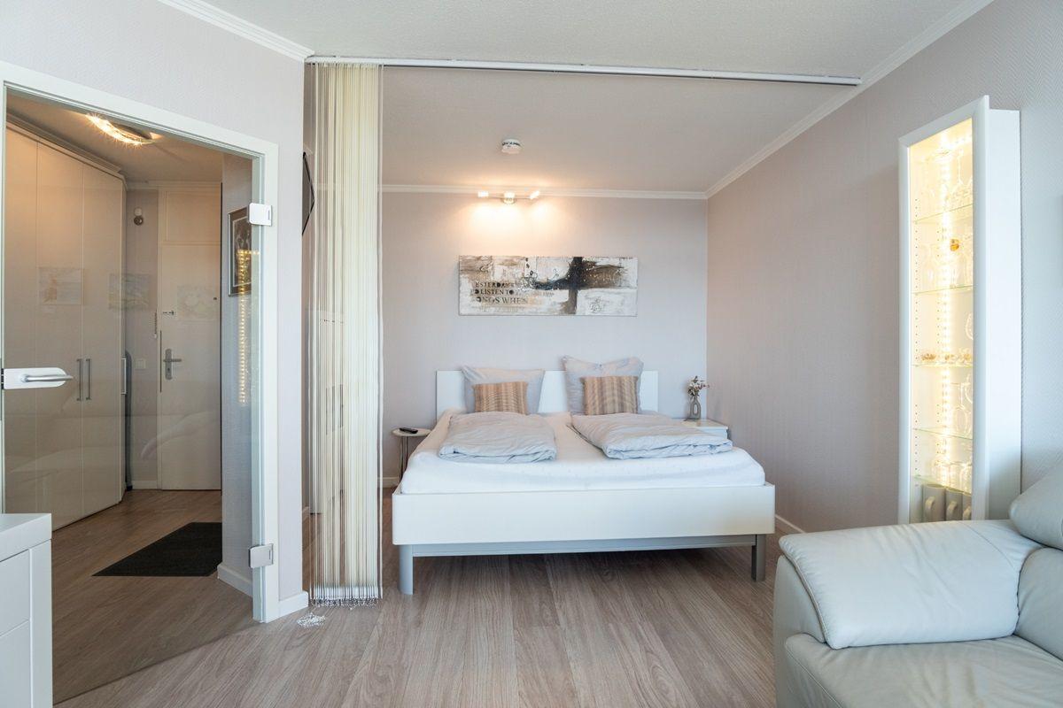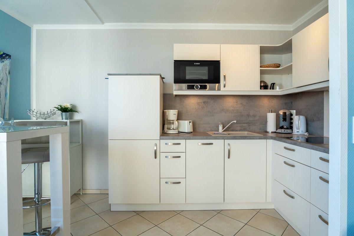 Die moderne Studiowohnung befindet sich in der zwölften Etage und verfügt auf ihren 45m² über einen sonnigen Wohn- und Schlafbereich mit einem TV-Bereich und Essecke im vorderen Bereich mit Zugang zum Südbalkon. Im hinteren Bereich befindet sich ein gemütliches Doppelbett (2 x 90 x 180cm). Die wohnung wurde für zwei Personen optimiert. Bei Bedarf findet eine dritte Person (für Kinder geeignet) bequem auf dem Schlafsofa Platz. Die offene Küchenzeile ist u.a. mit einem Geschirrspüler und einem Mikrowellen-Backofen-Kombigerät ausgestattet.