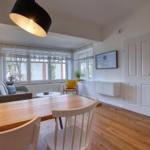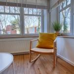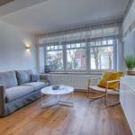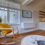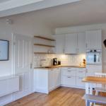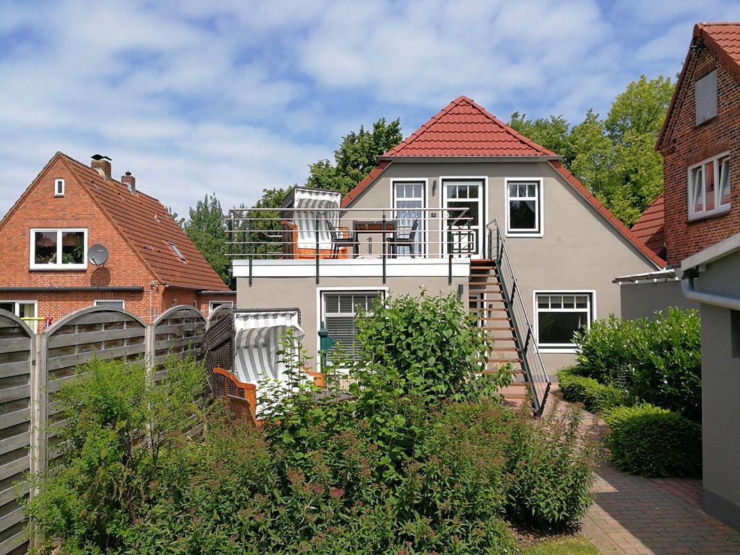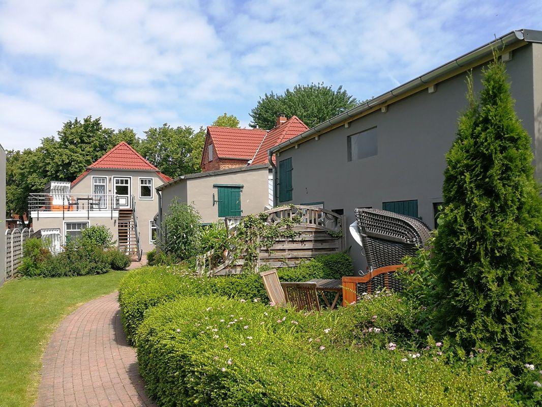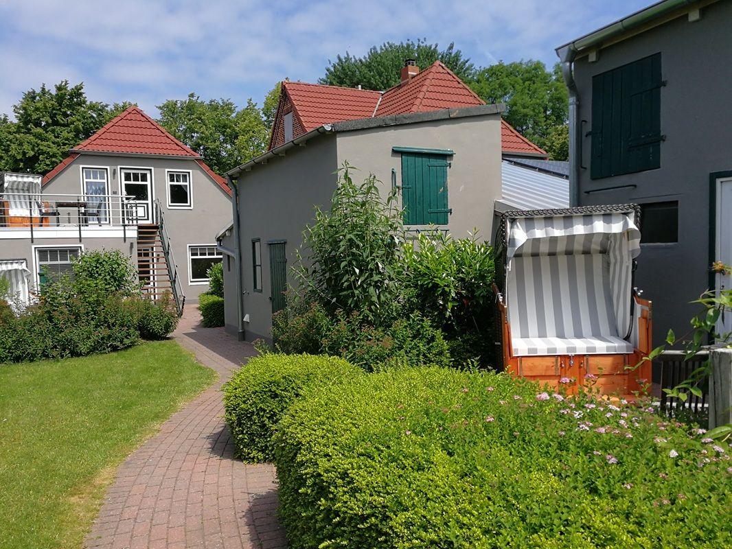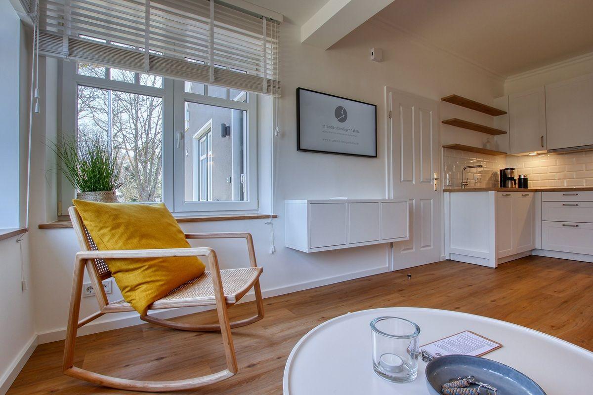 Durch die Fenster fällt der Blick ins Grüne – hinter dem noch die Ostsee und der Yachthafen durchblitzen. Nur wenige Gehminuten sind es zum Wasser, zum Hafen und zur Innenstadt.