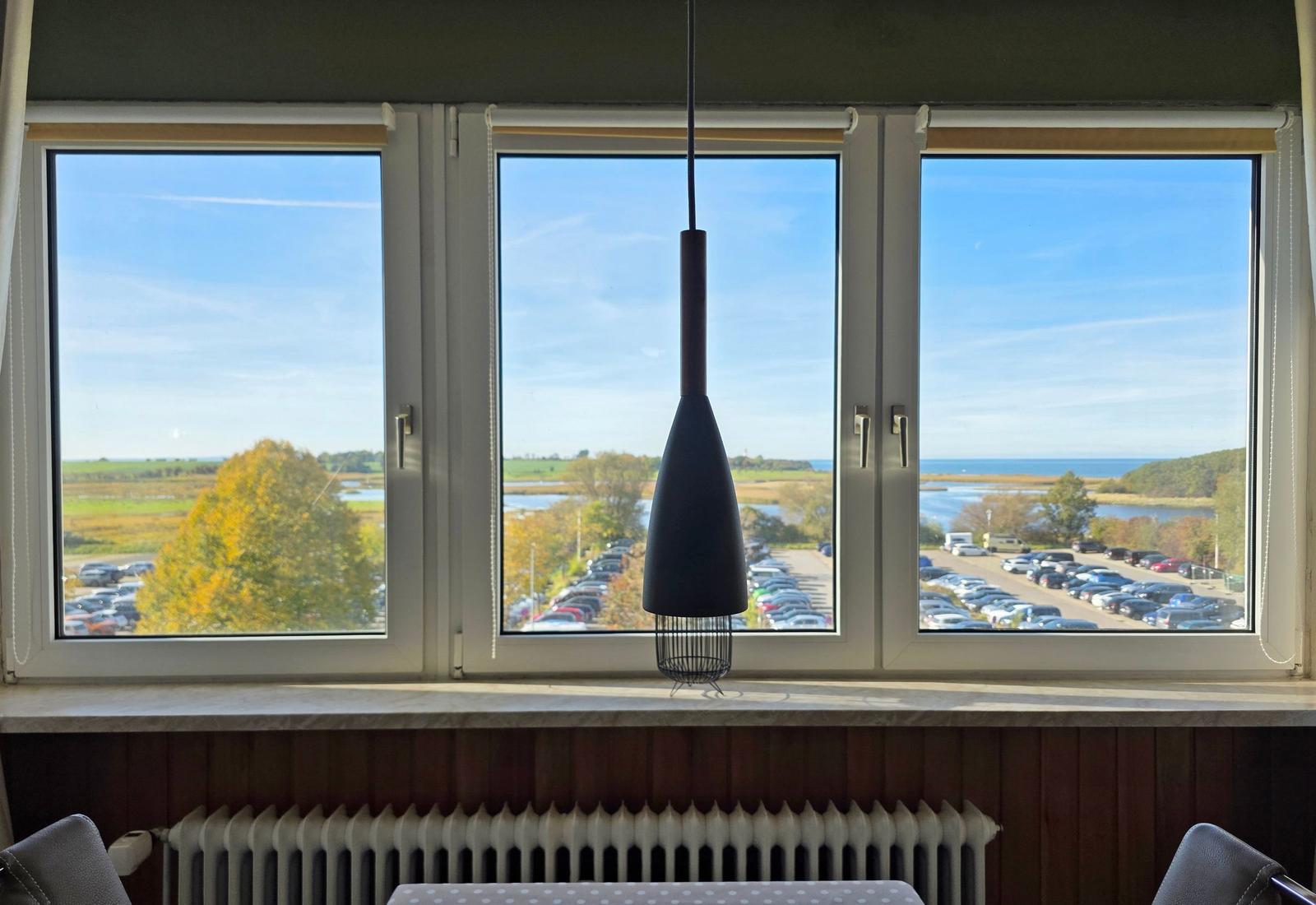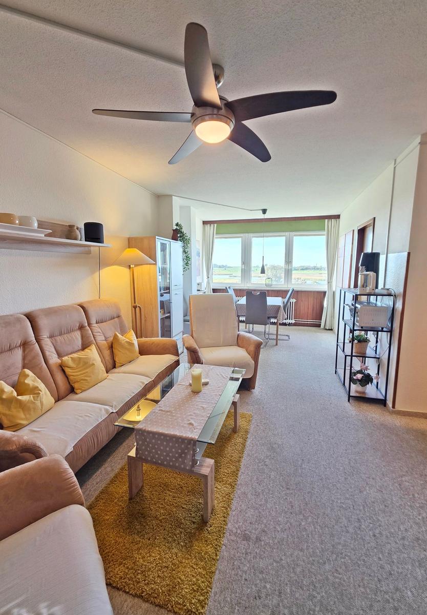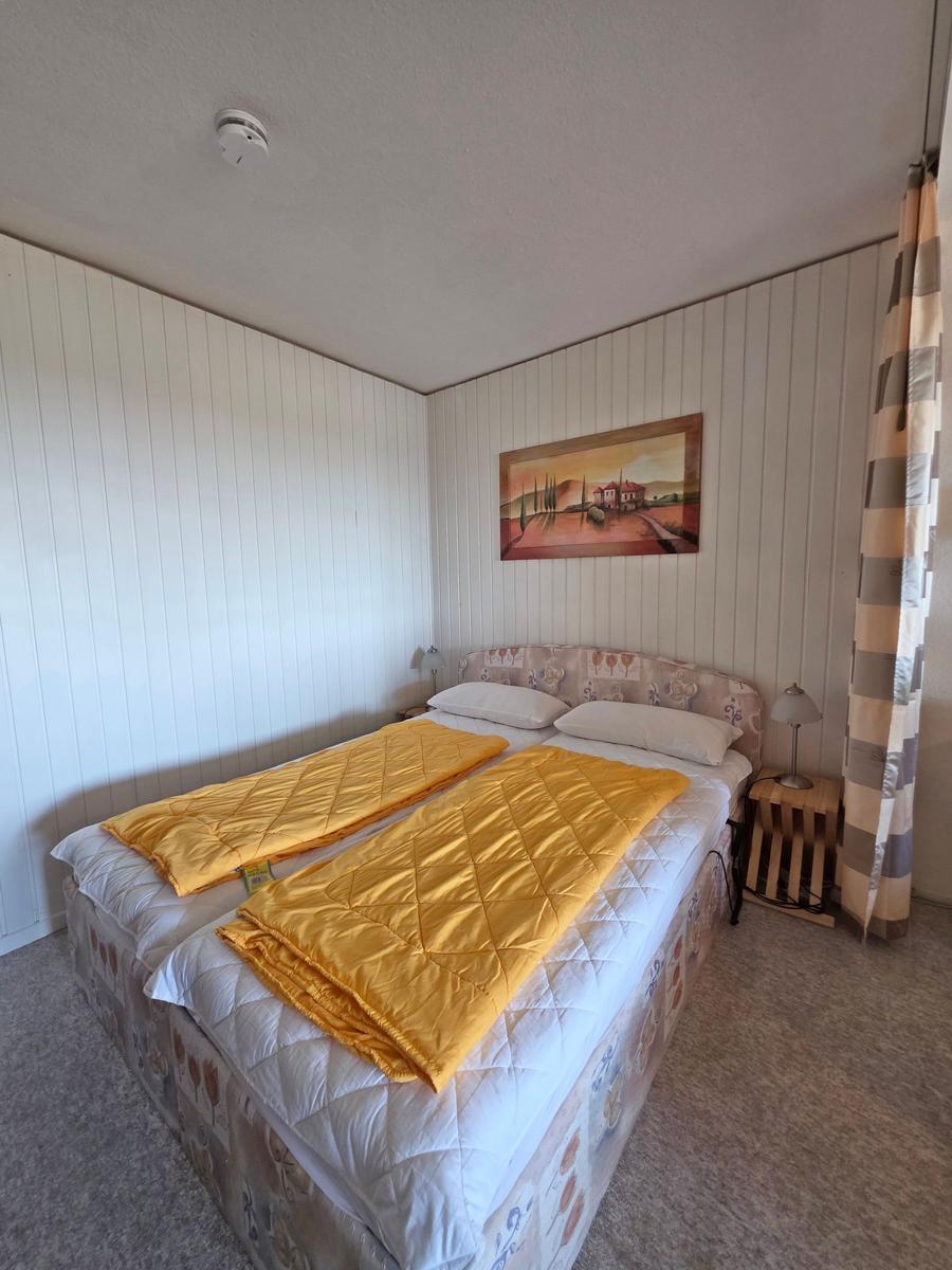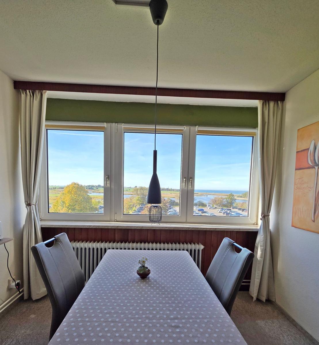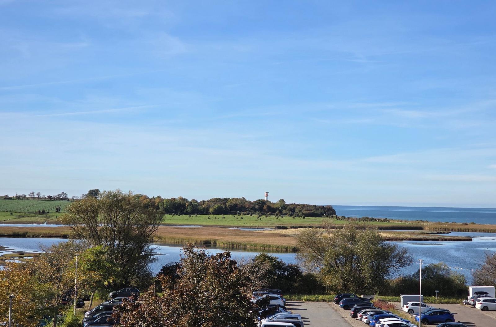 Die großzügige Ferienwohnung in der 4. Etage bietet auf 50 m² Platz für bis zu fünf Personen. Der Wohnbereich ist mit einer komfortablen Couchgarnitur, zwei Sesseln, einem Flachbild-TV mit integriertem DVD-Player sowie einem Esstisch ausgestattet, der einen Ausblick Richtung Leuchtturm und Steilküste ermöglicht. Der offene Schlafbereich ist mit zwei Einzelbetten ausgestattet, während im Kinderzimmer ein Etagenbett und ein Babybett für Kleinkinder bereitstehen. Die funktionale Küche verfügt über einen 4-Platten-Herd, Kühlschrank, Kaffeemaschine, Wasserkocher und Toaster. Das moderne Badezimmer ist mit einer Dusche, WC und Waschbecken ausgestattet. WLAN ist kostenlos verfügbar und die Wohnung bietet ausreichend Stauraum. Gemeinschaftliche Einrichtungen im Ferienpark umfassen Wellnessbereiche, Sportanlagen und Spielplätze, die eine Vielzahl von Freizeitmöglichkeiten bieten. Ein kostenfreier Parkplatz ist ebenfalls vorhanden.