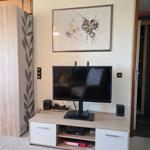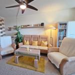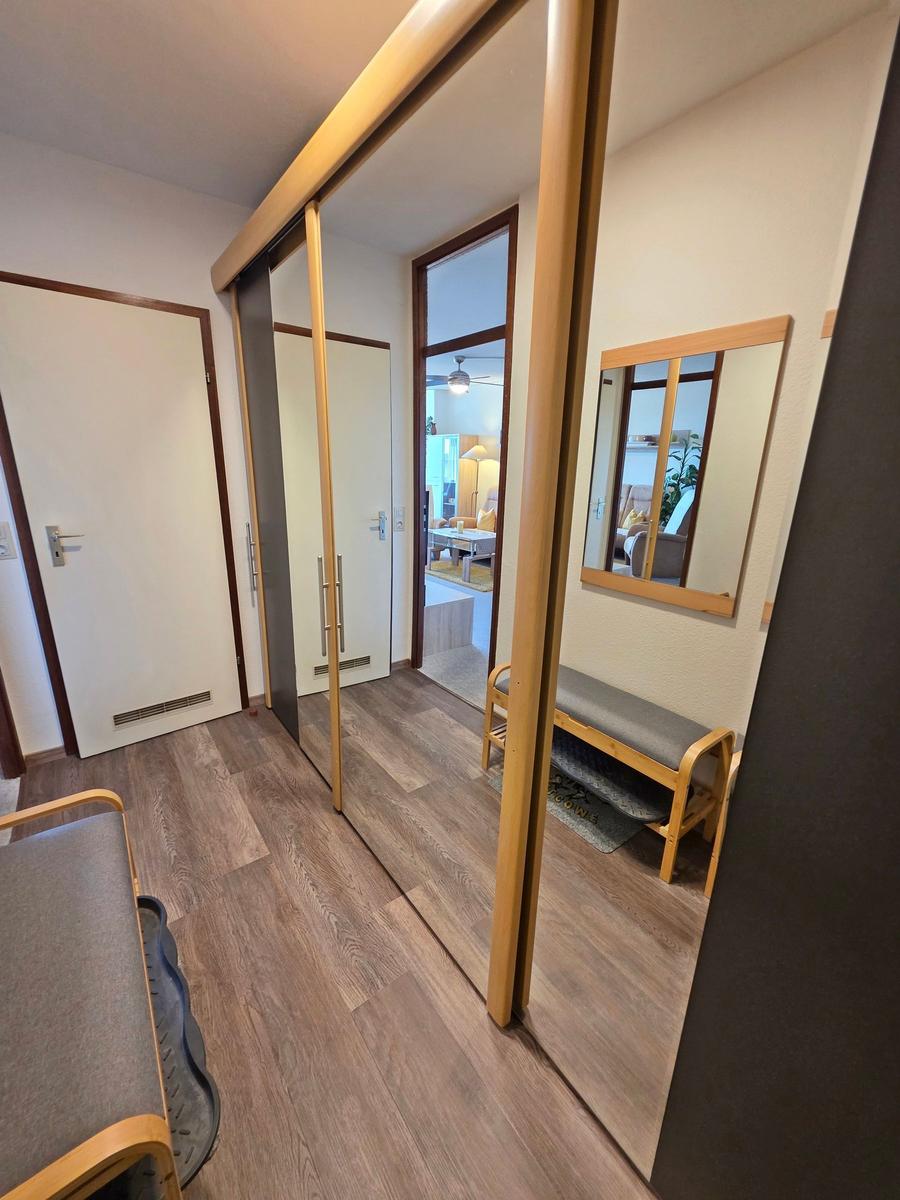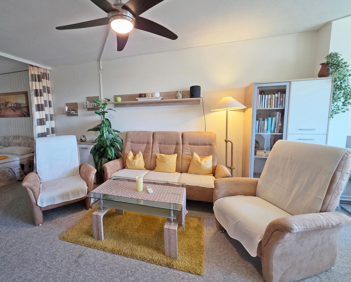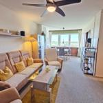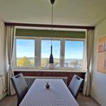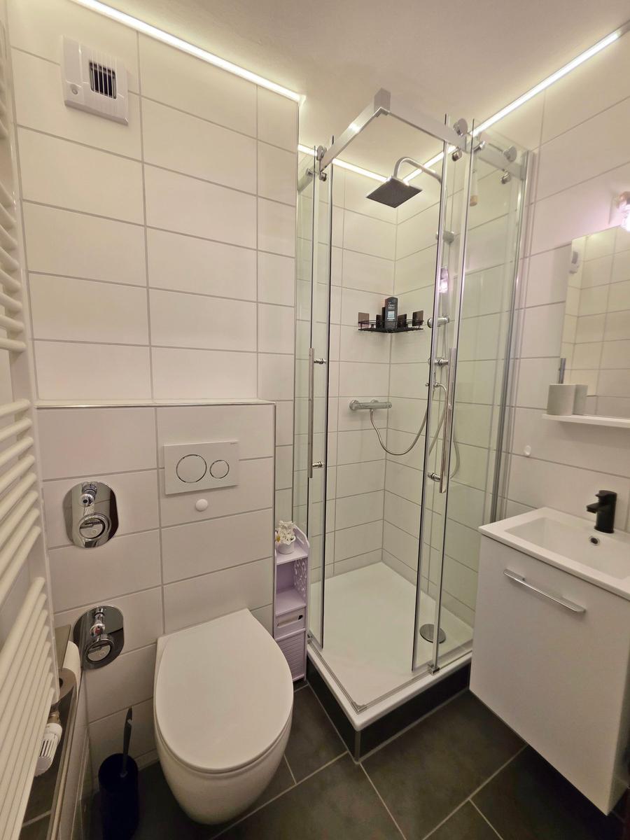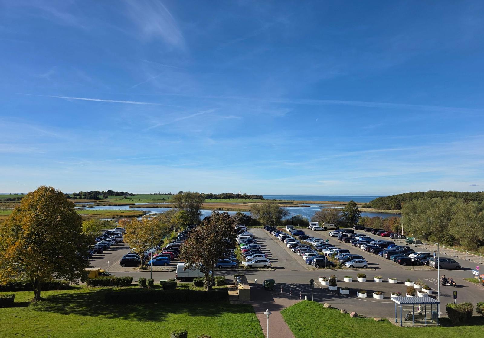 Die großzügige Ferienwohnung in der 4. Etage bietet auf 50 m² Platz für bis zu fünf Personen. Der Wohnbereich ist mit einer komfortablen Couchgarnitur, zwei Sesseln, einem Flachbild-TV mit integriertem DVD-Player sowie einem Esstisch ausgestattet, der einen Ausblick Richtung Leuchtturm und Steilküste ermöglicht. Der offene Schlafbereich ist mit zwei Einzelbetten ausgestattet, während im Kinderzimmer ein Etagenbett und ein Babybett für Kleinkinder bereitstehen. Die funktionale Küche verfügt über einen 4-Platten-Herd, Kühlschrank, Kaffeemaschine, Wasserkocher und Toaster. Das moderne Badezimmer ist mit einer Dusche, WC und Waschbecken ausgestattet. WLAN ist kostenlos verfügbar und die Wohnung bietet ausreichend Stauraum. Gemeinschaftliche Einrichtungen im Ferienpark umfassen Wellnessbereiche, Sportanlagen und Spielplätze, die eine Vielzahl von Freizeitmöglichkeiten bieten. Ein kostenfreier Parkplatz ist ebenfalls vorhanden.