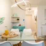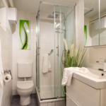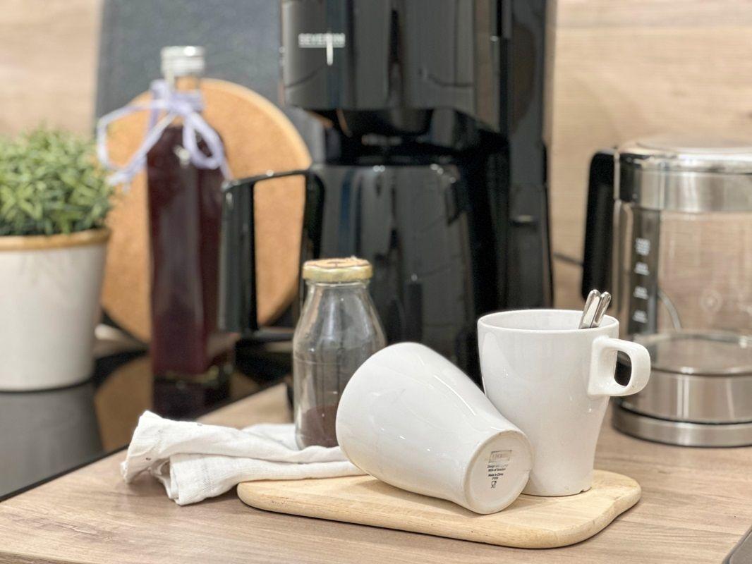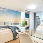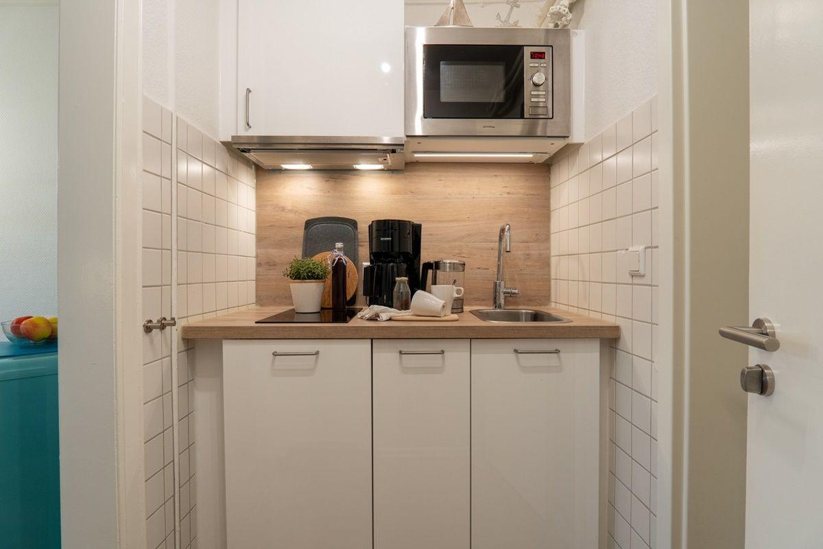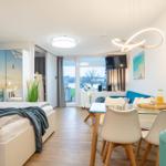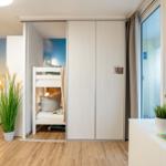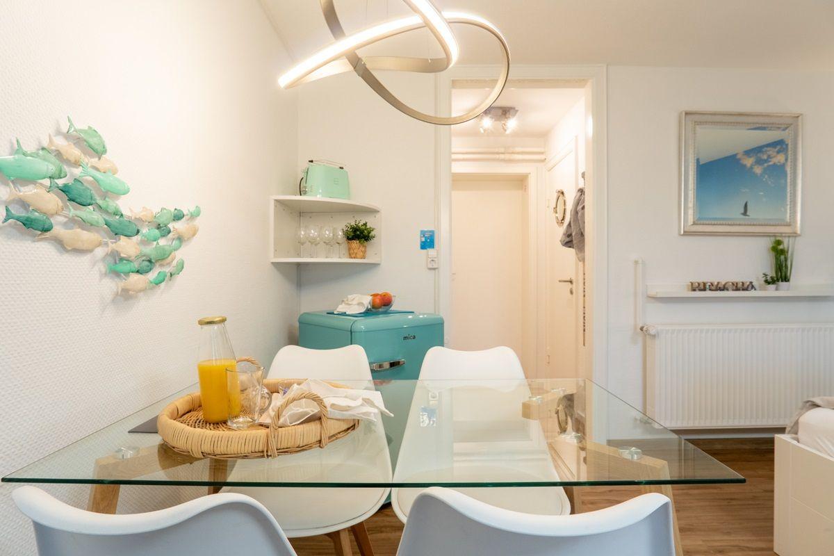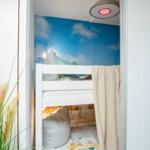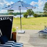 Die stylische Ferienwohnung befindet sich im Erdgeschoss und verfügt auf 31 m² über ein Badezimmer mit Duschkabine, eine kleine Küchenzeile und einen lichtduchfluteten Wohnbereich - augestattet mit einem gemütlichen Sofa und TV, einem großzügigen Essbereich für vier Personen und einem Doppelbett (ca. 160 x 200cm) im Schlafbereich. Das Etagenbett (ca. 2 x 180 x 80 cm) ist über zwei Schiebetüren vom Wohnbereich optisch abgetrennt. Das Fenster zum Etagenbett verfügt über einen eigenen Insektenschutz, ebenso die Terrassentür. Von der Sofaecke aus gelangen Sie auf die Holzterrasse mit tollem Blick zum Binnensee.