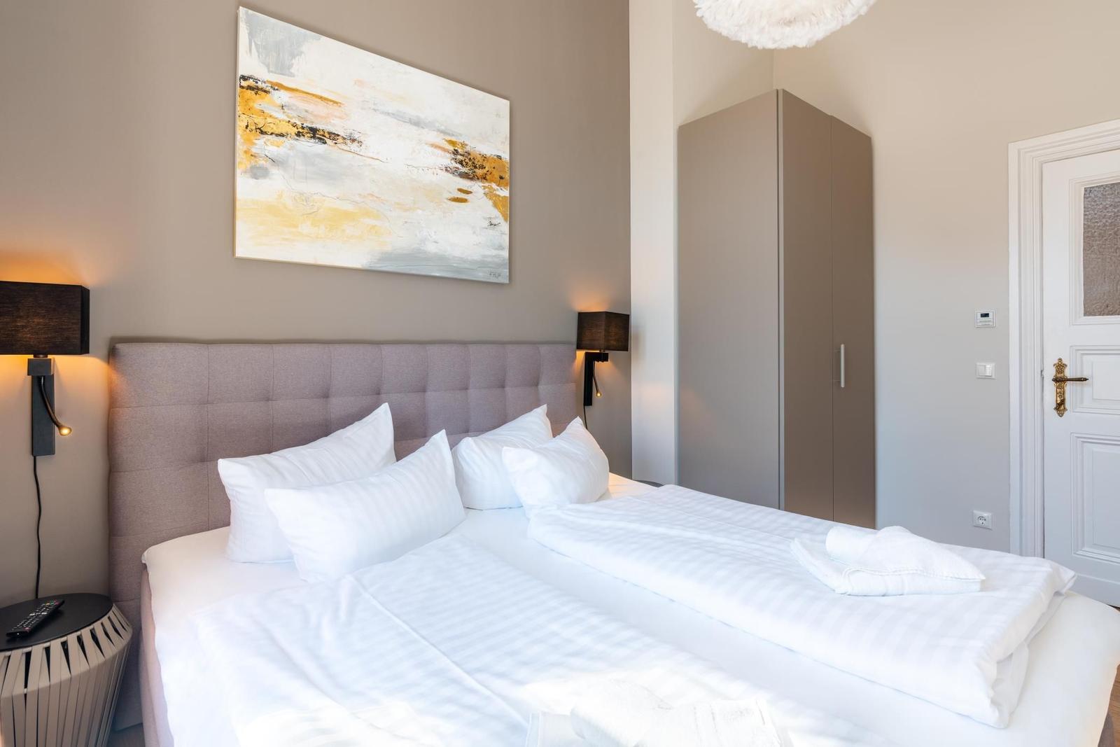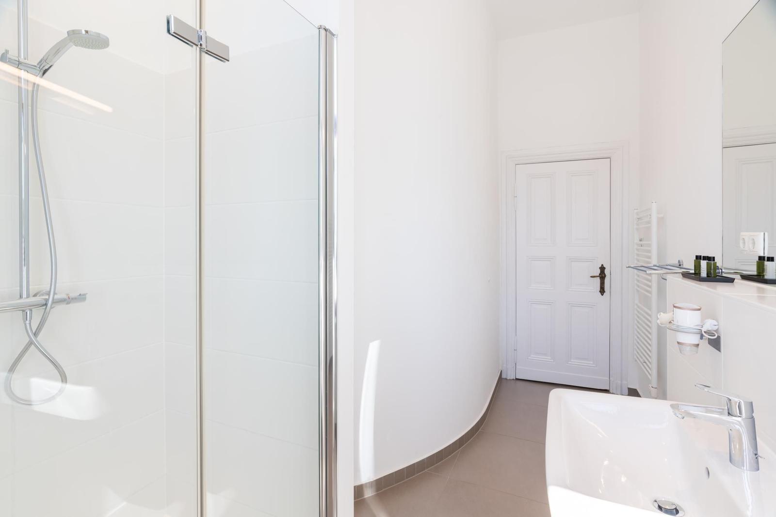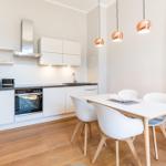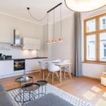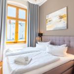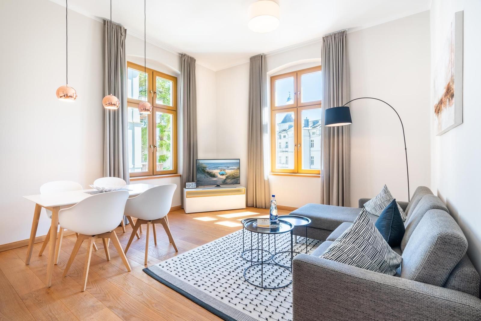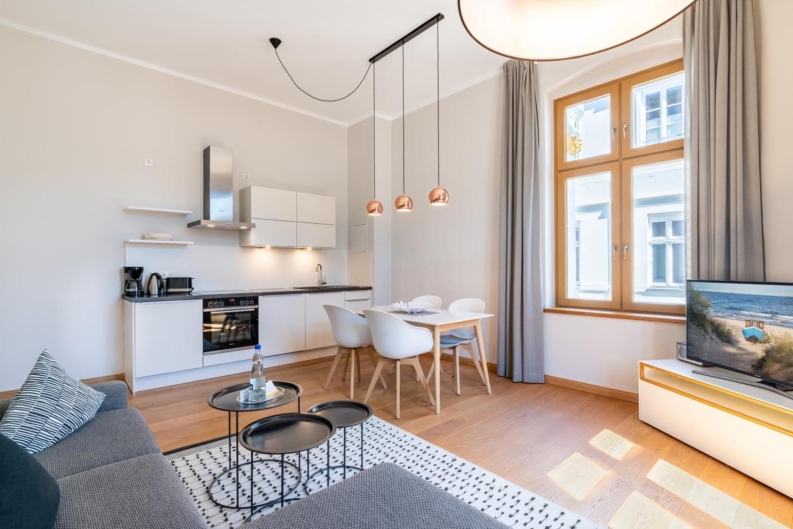 Die Ferienwohnung in der Villa Marie besticht durch ihre lichtdurchfluteten, hohen Räume und eine geschmackvolle Einrichtung im nordischen Stil. Sie bietet Platz für zwei Personen und ist ideal für einen erholsamen Urlaub. Das großzügige Wohnzimmer verfügt über eine komfortable Sitzecke, einen modernen Smart-TV sowie eine Schlafcouch für einen dritten Übernachtungsgast. Die moderne Einbauküche ist mit hochwertigen Markengeräten ausgestattet und bietet einen unmittelbaren Essplatz. Das separate Schlafzimmer, ausgestattet mit einem hochwertigen Box-Springbett, sorgt für erholsame Nächte und hat ebenfalls einen Smart-TV. Gebührenfreies WLAN steht Ihnen zur Verfügung, und im Keller befinden sich eine Münzwaschmaschine und ein -trockner zur gemeinschaftlichen Nutzung. Ein gebührenfreier PKW-Stellplatz sowie Abstellmöglichkeiten für Fahrräder sind vorhanden.