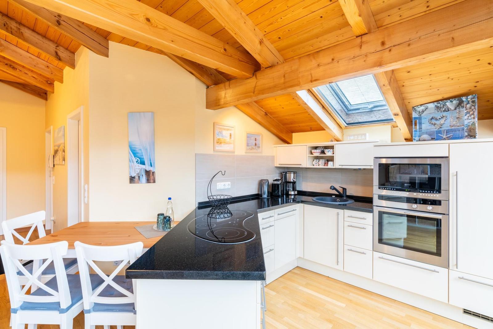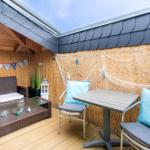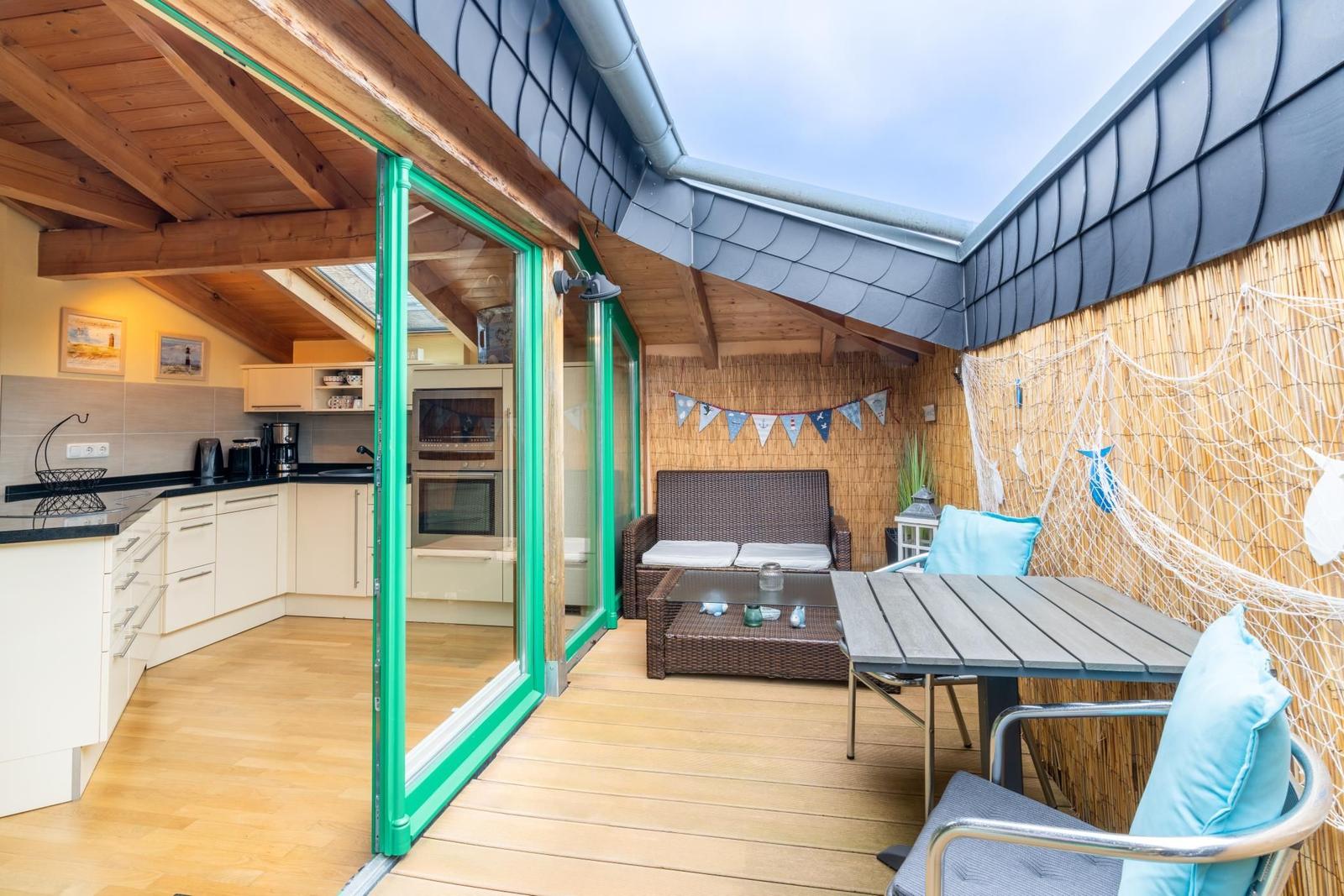 Die Ferienwohnung in der Villa Perkunos bietet einen einladenden Außenbereich, der das Herzstück für entspannende Stunden im Freien darstellt. Die geschützte Dachterrasse lädt dazu ein, bis in den Herbst hinein viele Momente an der frischen Luft zu genießen. Diese Terrasse ist ideal, um sich bei schönem Wetter zurückzulehnen und die ruhige Atmosphäre über den Dächern von Heringsdorf zu erleben. Gäste finden hier einen Ort der Erholung und können den nahegelegenen Strand, der nur 400 Meter entfernt ist, sowie die von Bäumen gesäumte Friedensstraße in unmittelbarer Nähe erkunden. Die Nutzung des Außenbereiches ist gemeinschaftlich, was einen geselligen Austausch mit anderen Gästen ermöglicht. Insgesamt bietet der Außenbereich der Villa Perkunos eine perfekte Ergänzung zu den Annehmlichkeiten der Wohnung und dem kulturellen Reichtum der Umgebung.