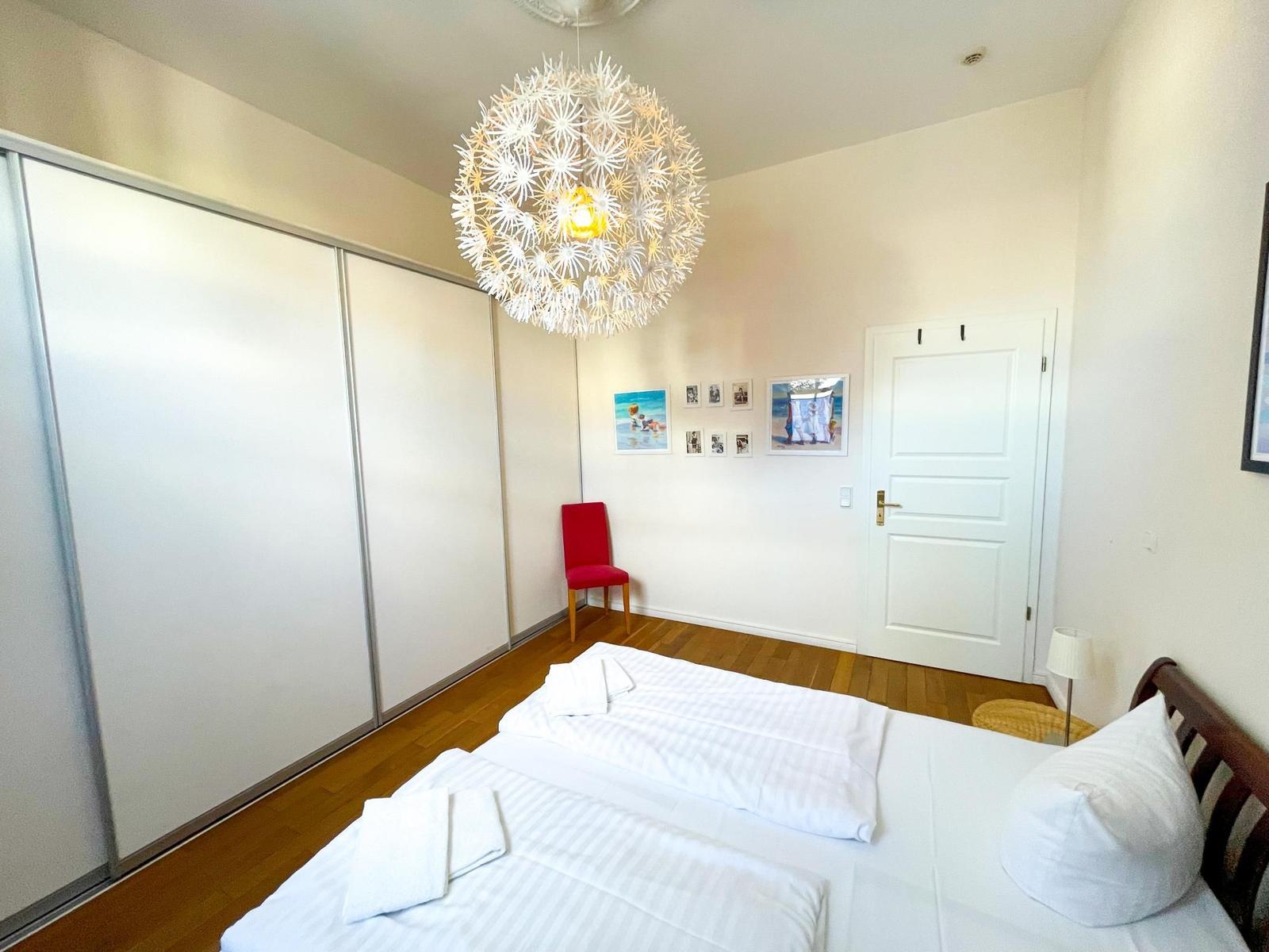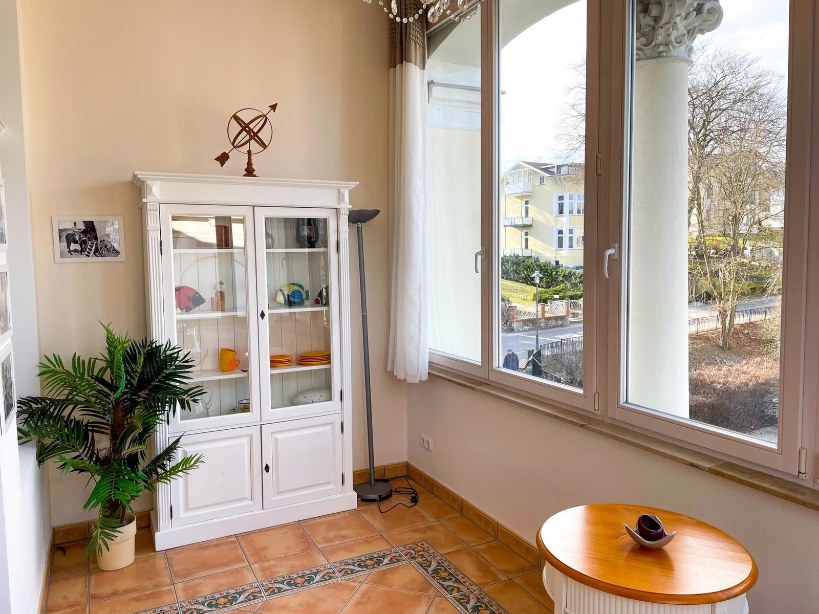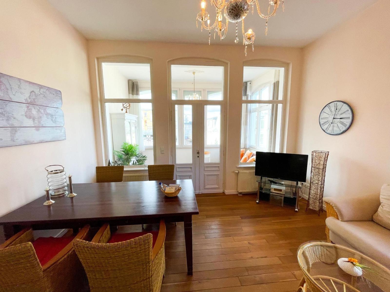 Genießen Sie Ihren Usedom-Aufenthalt in dieser schönen und stilvollen Ferienwohnung. Auf einer Wohnfläche von ca. 80m² verteilen sich zwei separate Schlafzimmer, eine separate Küche sowie ein schöner Wohnraum mit angrenzender Veranda. Bad und WC sind getrennt. Im Wohnzimmer lädt eine gemütliche Sitzecke zum Relaxen ein. Für die Unterhaltung stehen ein moderner Flachbild-Fernseher mit Blu-Ray-Player sowie eine hoch moderne Audioanlage bereit. Am schönen und großzügigen Esstisch kann gegessen, gespielt und geklönt werden. Für eine ruhige Muße- oder Lesestunde bietet sich die, vom Wohnzimmer aus zu betretende, Veranda an. Mit Couch, Sessel und schöner Vitrine ausgestattet, bildet dieser Raum einen herrlichen Rückzugsort. Die separate Küche ist komplett ausgestattet und lässt kaum einen Wunsch offen. Zwei separate Schlafzimmer mit jeweils einem Doppelbett stehen den Gästen zur Verfügung. In beiden Zimmern stehen Kleiderschrank für die Urlaubsgarderobe.