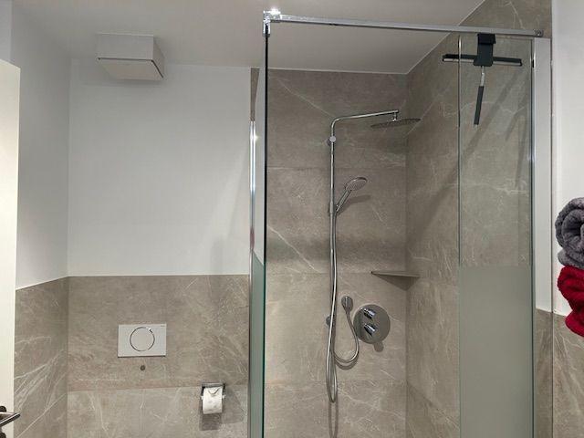 Das Badezimmer mit Doppelwaschbecken großer Dusche bietet viel Platz.