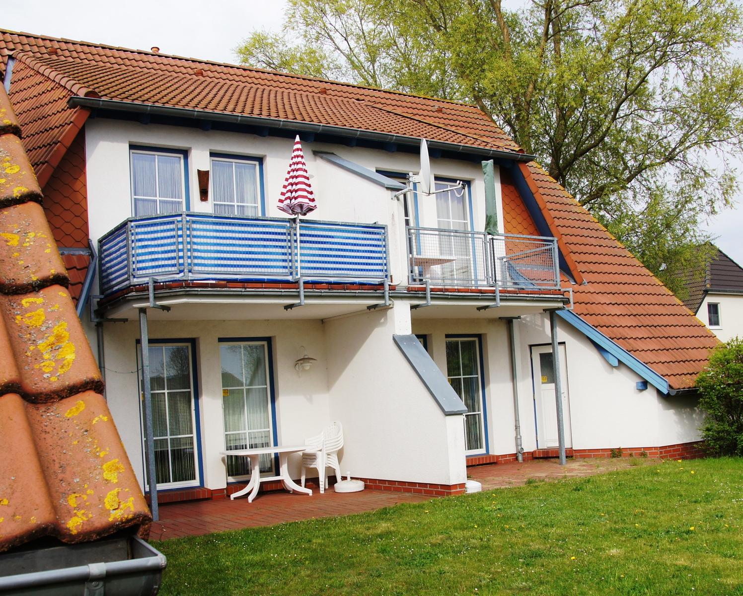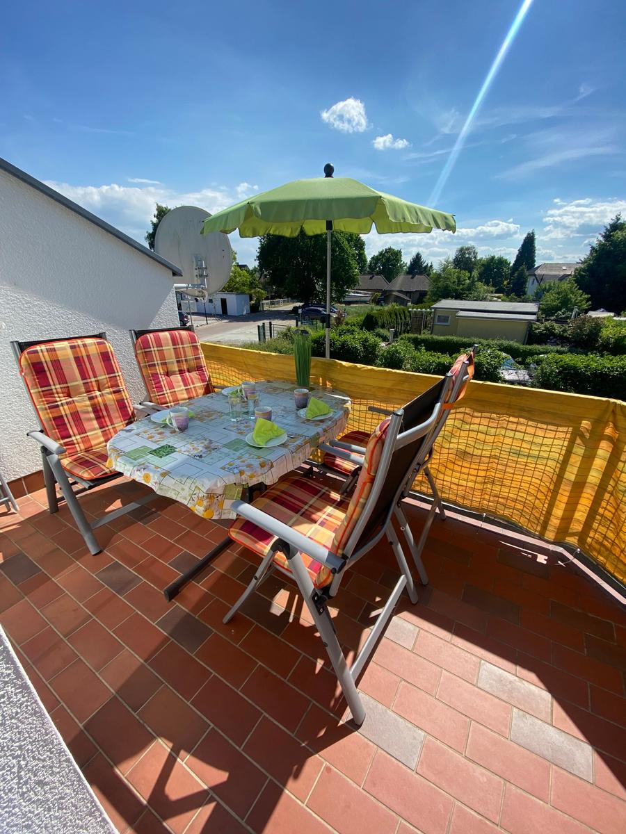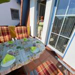 Vom Wohnzimmer aus gelangen Sie auf den einladenden Südbalkon, der mit einem Tisch, sechs Stühlen und einem Sonnenschirm ausgestattet ist. Genießen Sie hier entspannte Stunden mit einem guten Buch oder lassen Sie einfach die Seele baumeln. Auch Ihre Badesachen können Sie hier trocknen – der Balkon ist ein idealer Ort, um die Sonne zu genießen. Von dort haben Sie außerdem einen herrlichen Ausblick auf die gepflegte Gartenanlage, die das Bild abrundet.