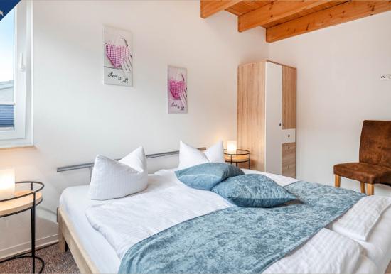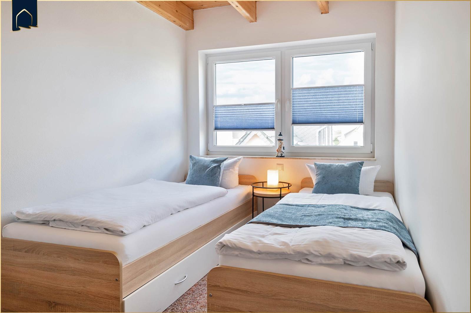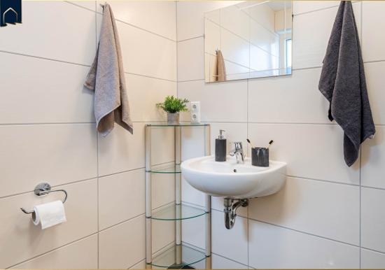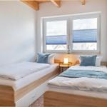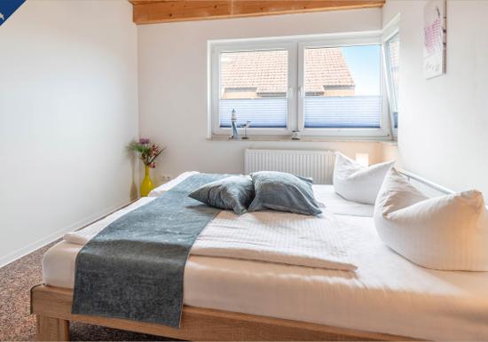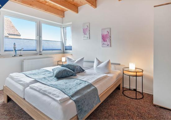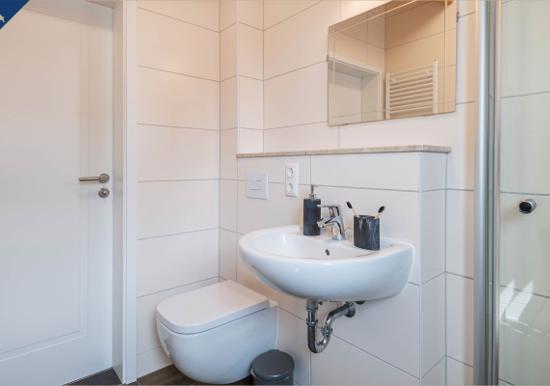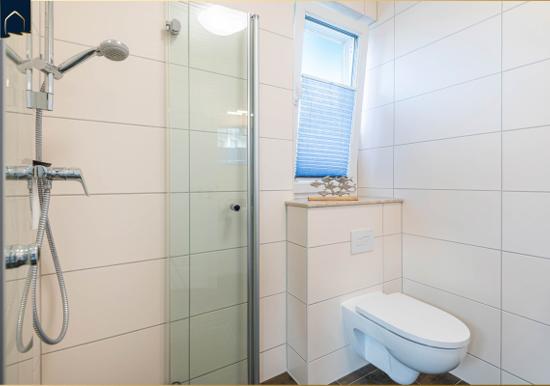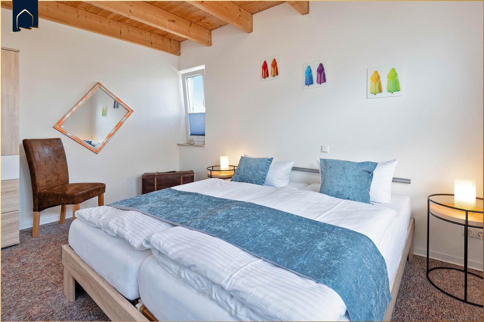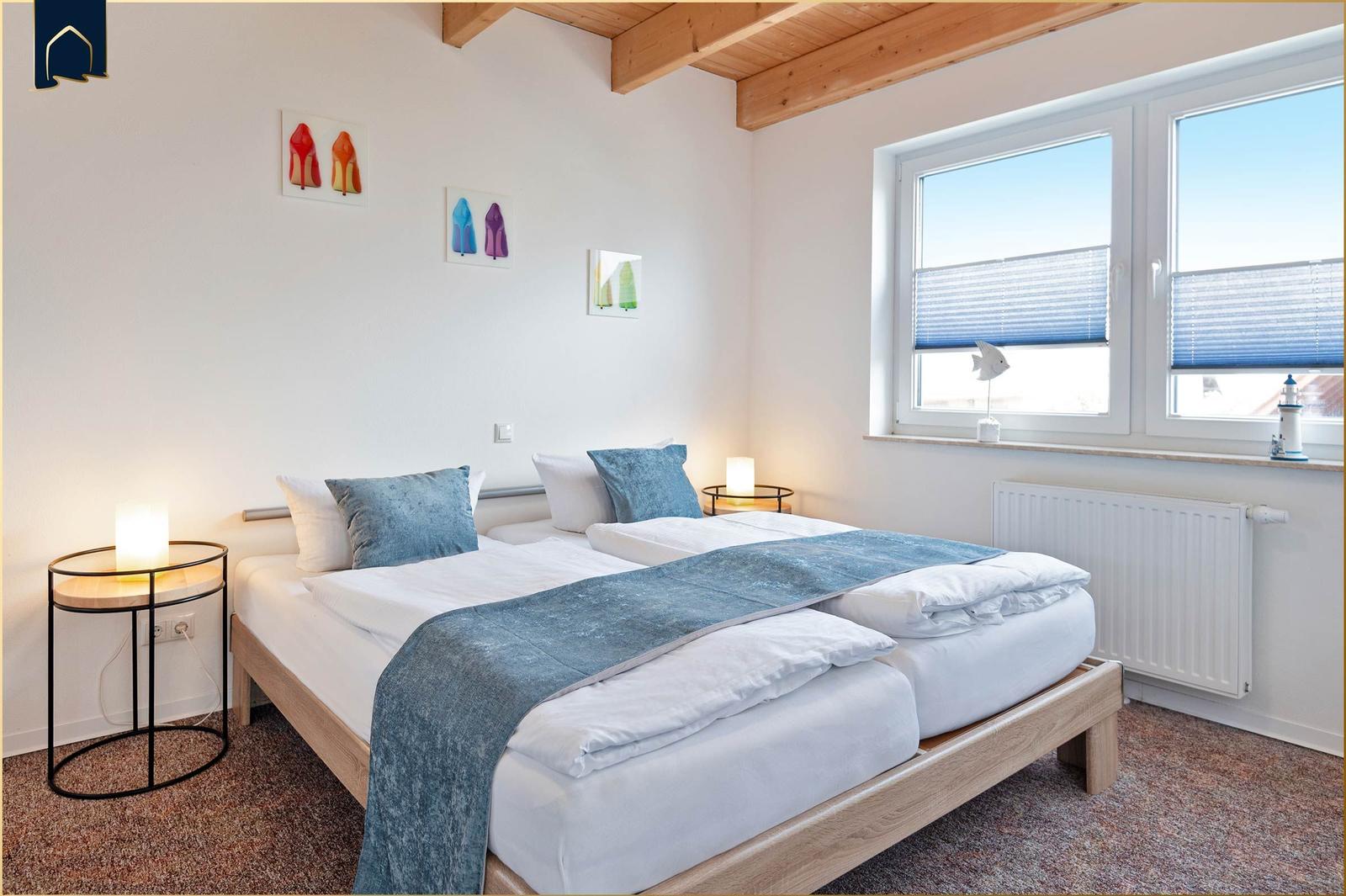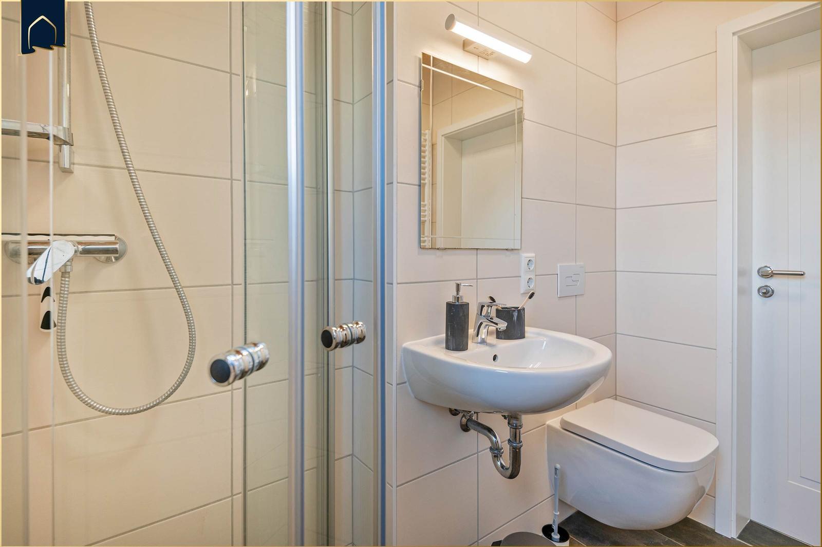 Das Schlafzimmer verfügt über ein hochwertiges Doppelbett und sorgt für erholsamen Schlaf. Das Badezimmer ist mit einer bodengleichen Dusche, Spiegel und einem Fenster ausgestattet und bietet angenehmen Komfort.