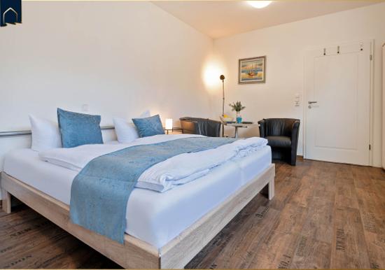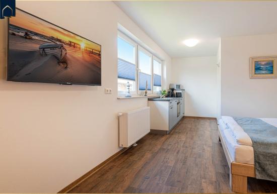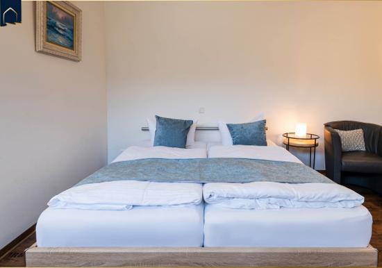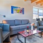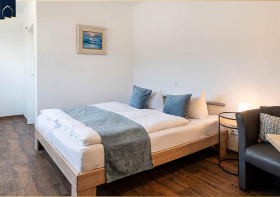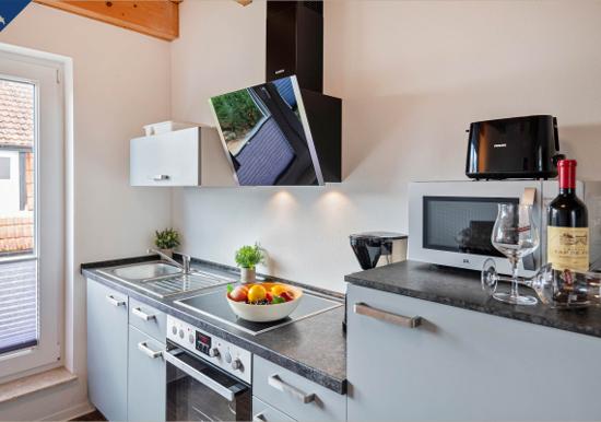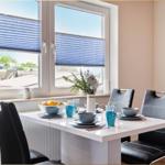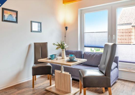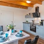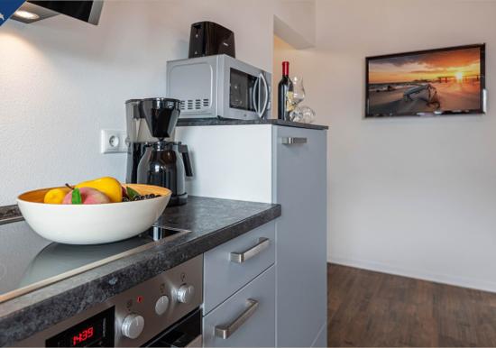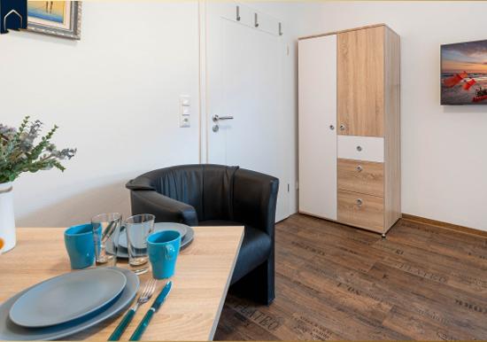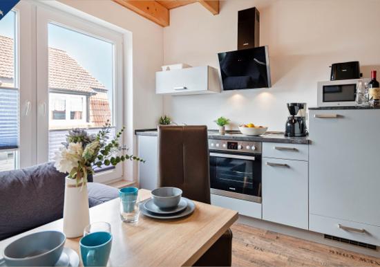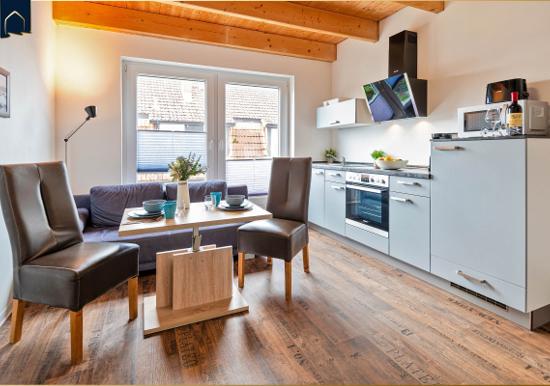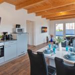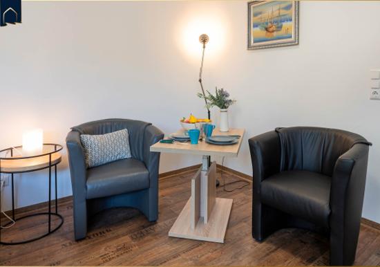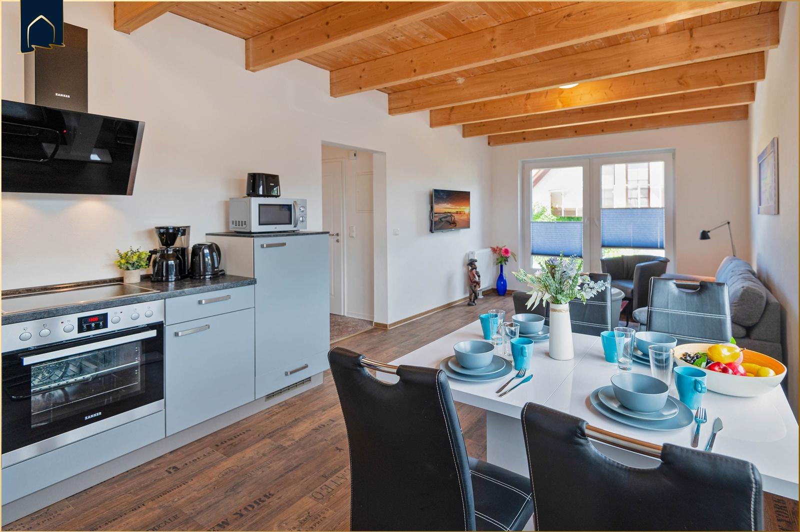 Die Ferienwohnung bietet eine moderne und komfortable Ausstattung, ideal für entspannte Zeiten. Im offenen Wohnbereich lädt ein gemütliches Sofa sowie ein Sessel zum Verweilen ein. Der Esstisch, umgeben von Geschirr und Besteck, ist perfekt für gemeinsame Mahlzeiten. Die voll ausgestattete Küche mit Elektro-/Gasherd, Backofen, Mikrowelle, Kühlschrank, Kaffeemaschine und Toaster lässt keine Wünsche offen.