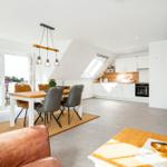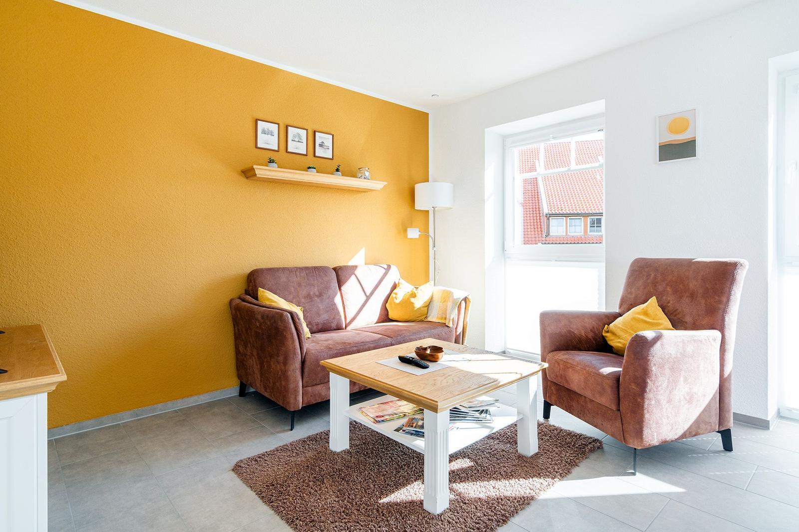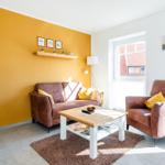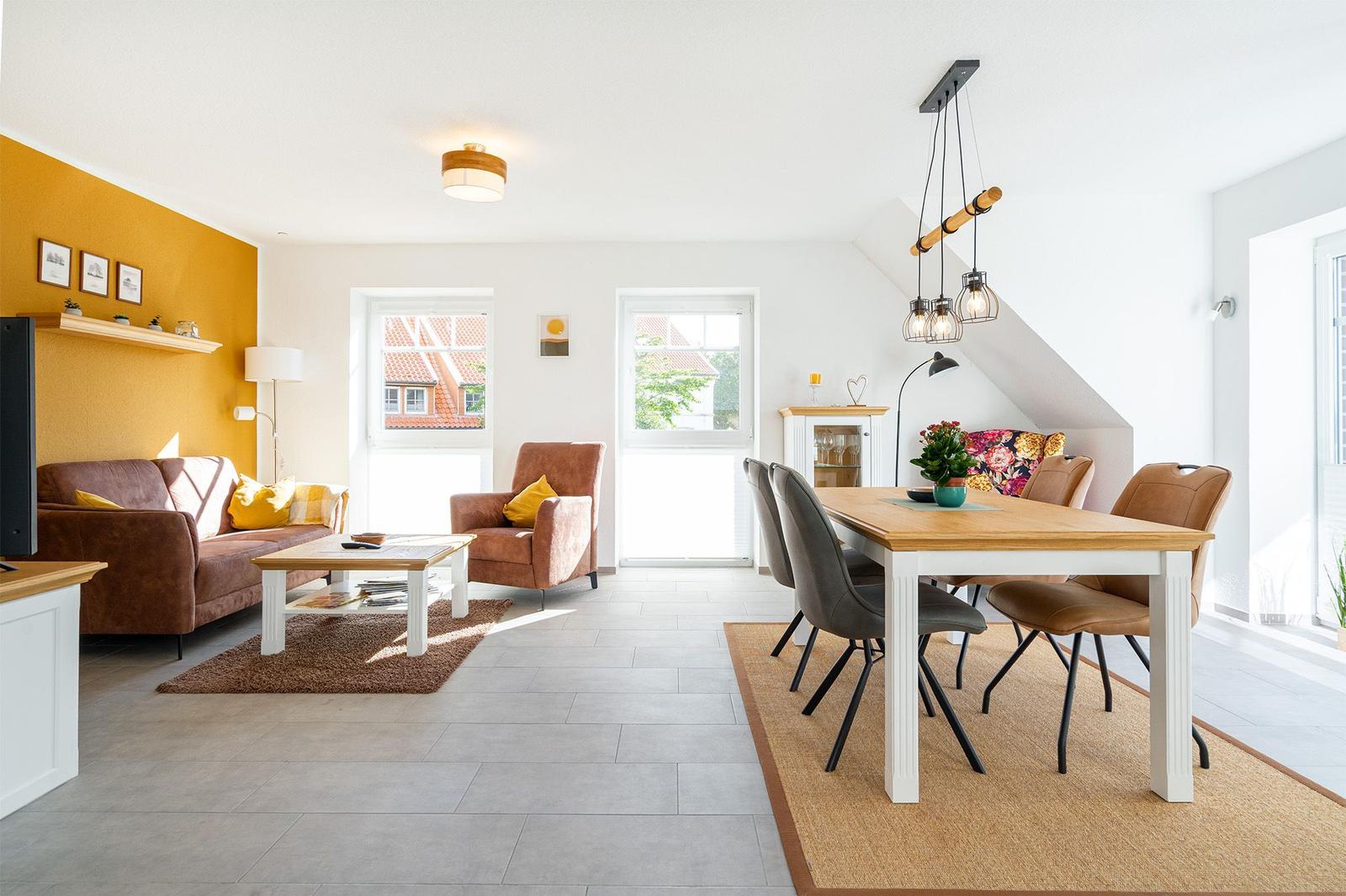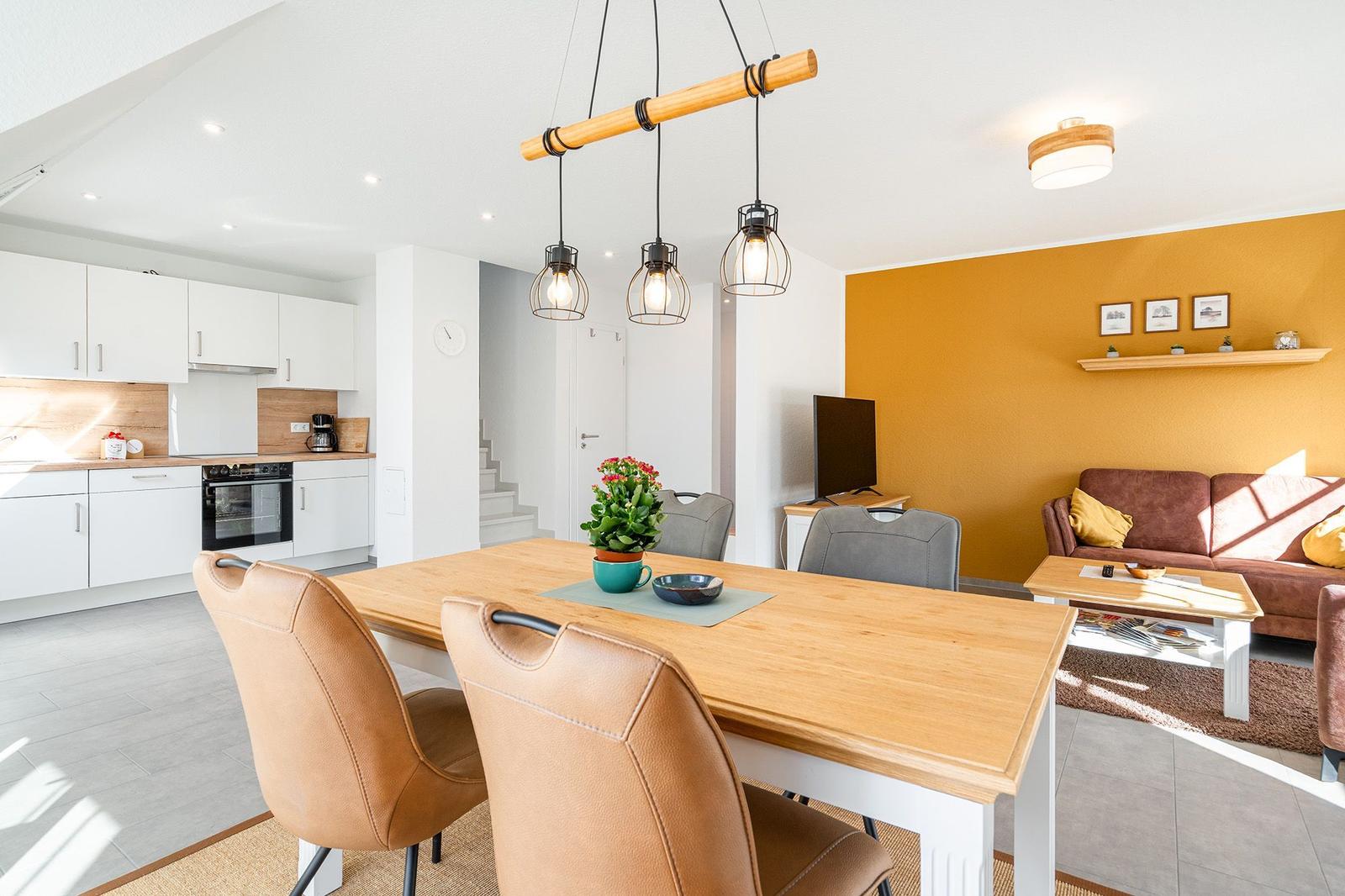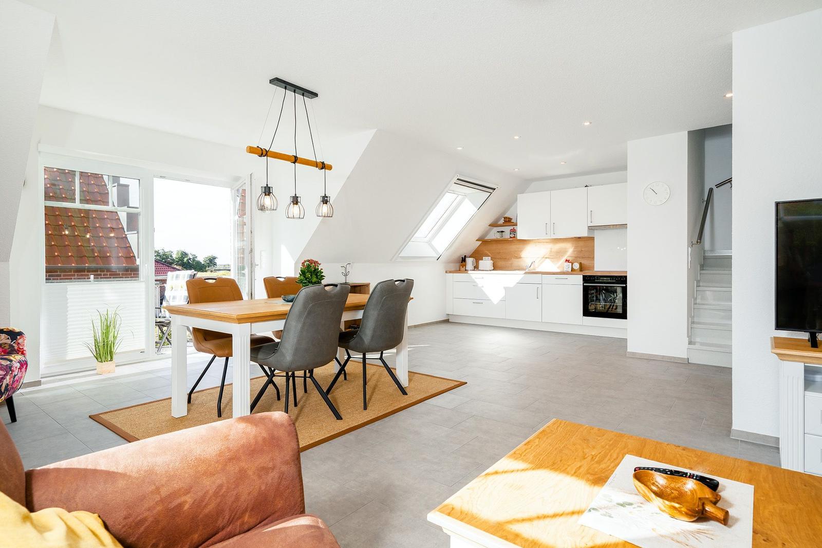 Die Ferienwohnung "Nordseebrise" im Greetsieler Grachtenpark bietet auf 80 Quadratmetern Platz für bis zu vier Personen. Der großzügige Wohn-Essbereich ist mit einer gut ausgestatteten Küchenzeile versehen, die ein Cerankochfeld, einen Backofen, einen Kühlschrank mit Gefrierfach, eine Spülmaschine sowie eine Kaffeemaschine, einen Toaster und einen Wasserkocher umfasst. Ein Esstisch mit vier Stühlen und eine bequeme Sofa-Landschaft mit großem Fernseher runden den Raum ab.