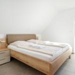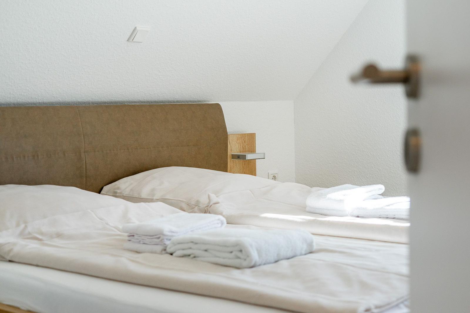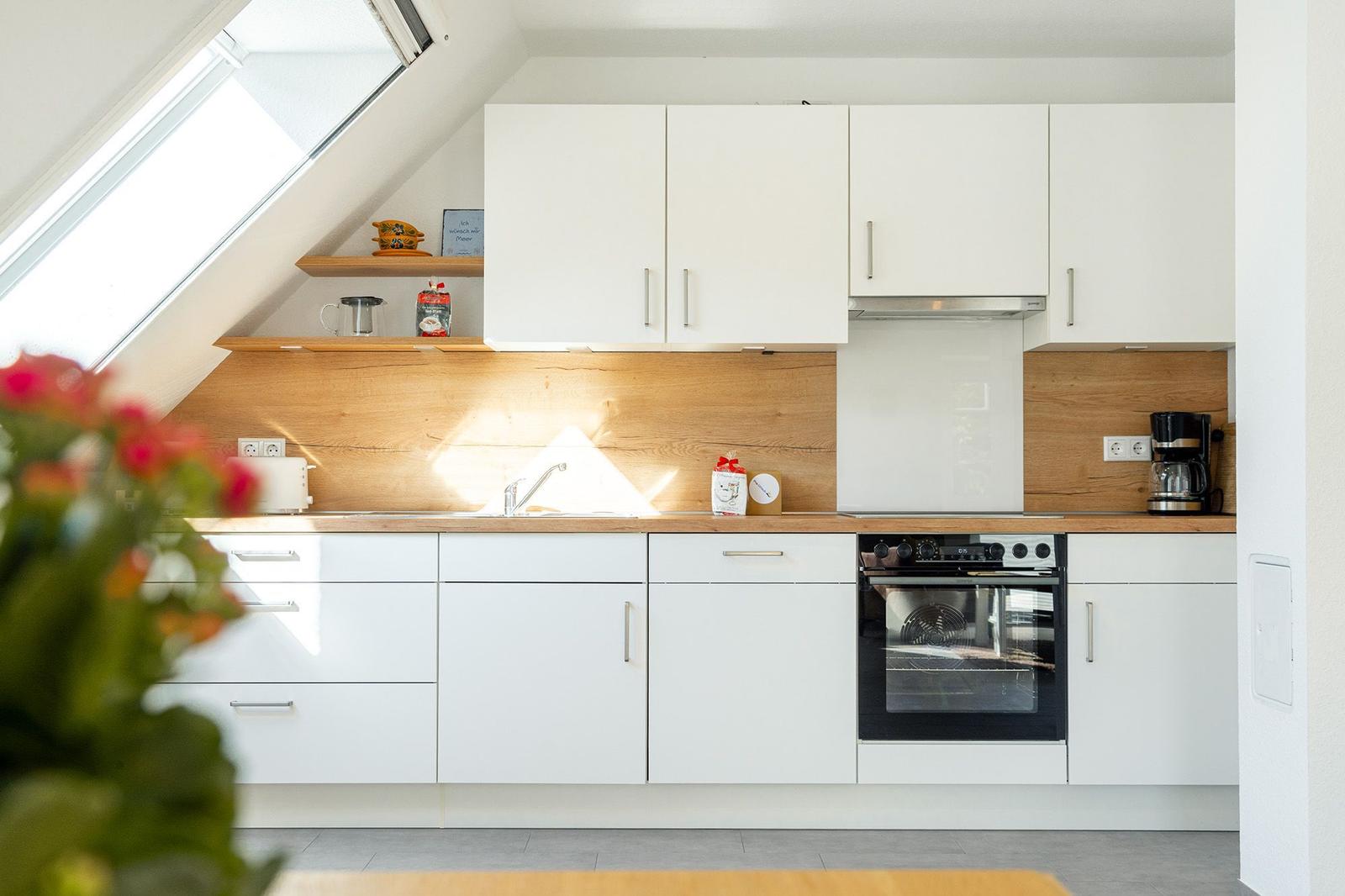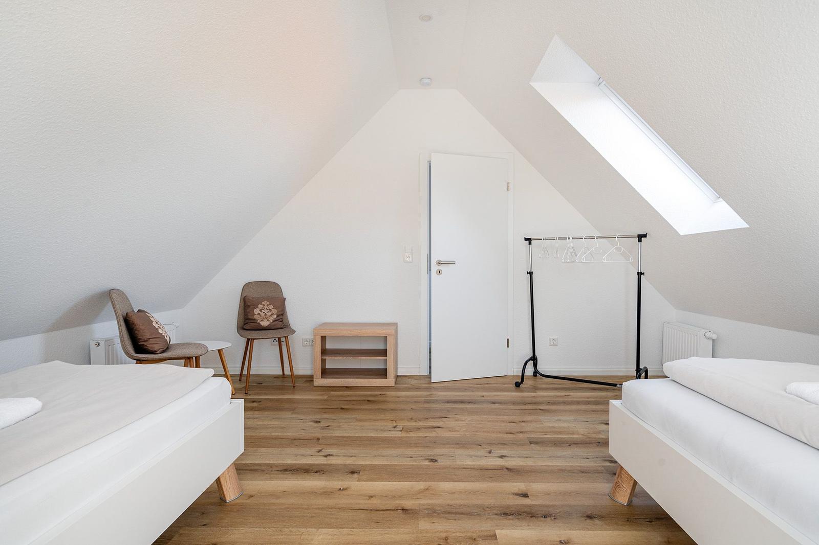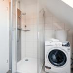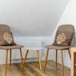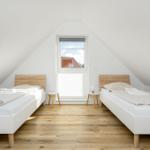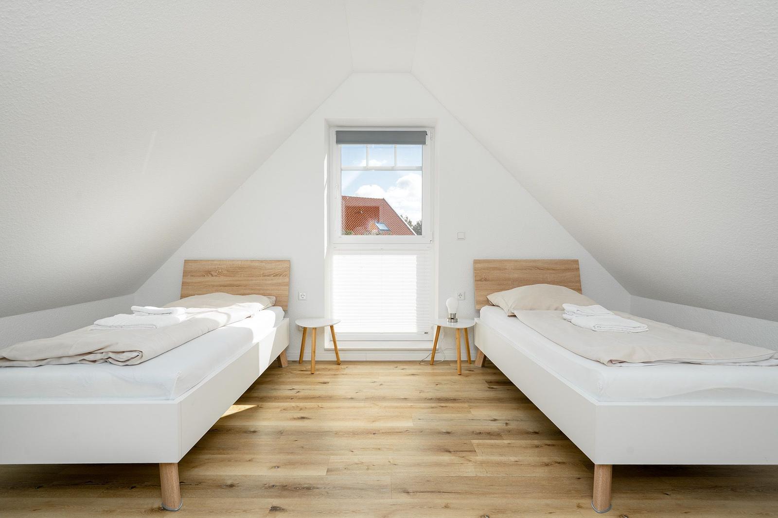 Im Schlafzimmer stehen ein Doppelbett, ein Kleiderschrank und ein weiterer Fernseher zur Verfügung, während das Duschbad mit Fön, Waschtrockner und einer ebenerdigen Dusche ausgestattet ist. Im Dachgeschoss befindet sich ein zusätzliches Schlafzimmer mit zwei Einzelbetten. Fliesen und Fußbodenheizung sorgen für Komfort im Obergeschoss, das Dachgeschoss ist mit Laminat ausgestattet. Kostenfreies WLAN ist ebenfalls verfügbar. Ein PKW-Stellplatz gehört zur Wohnung.