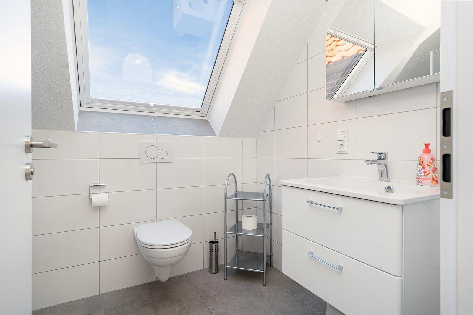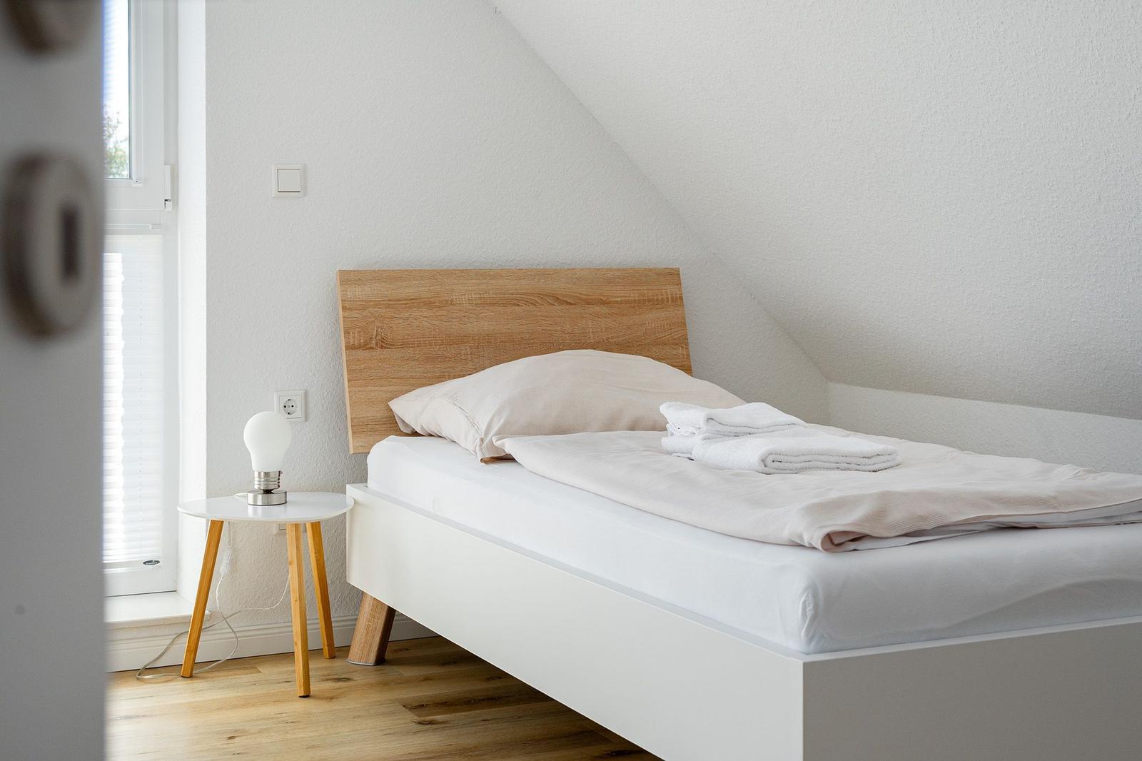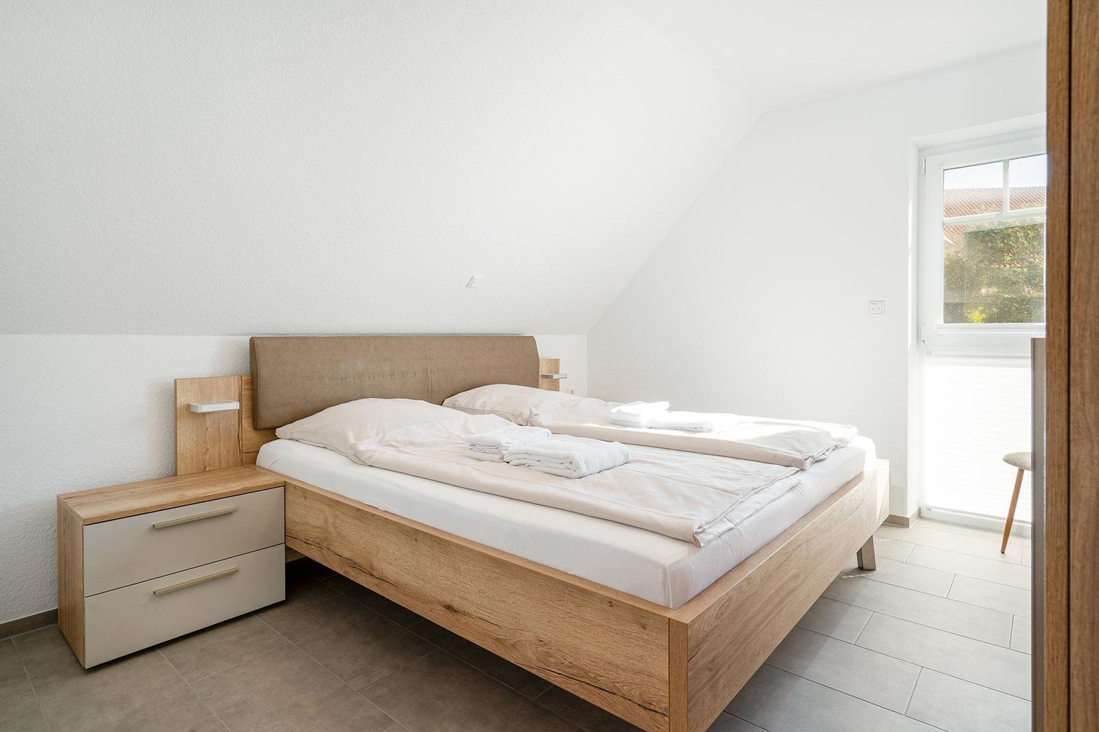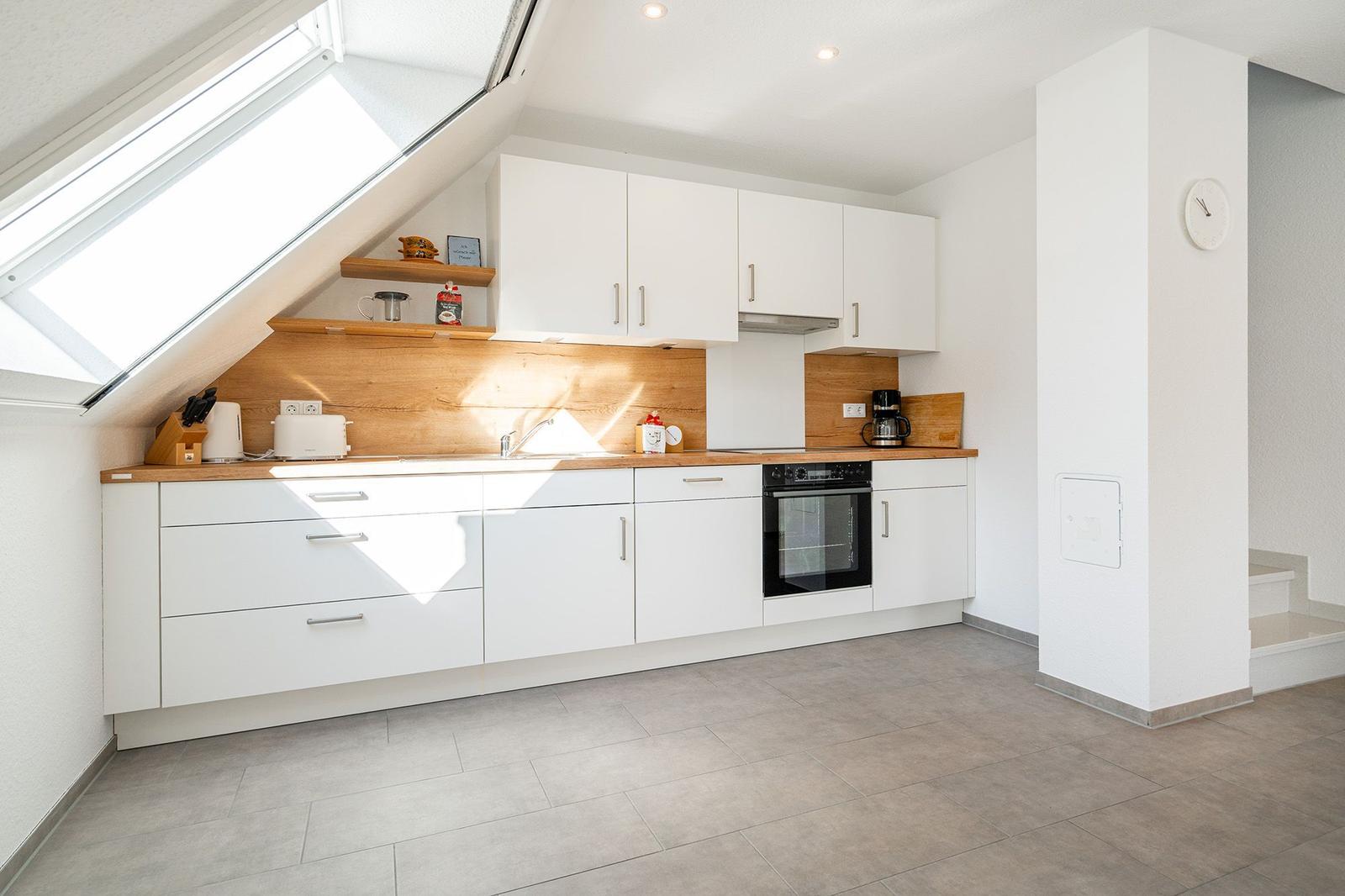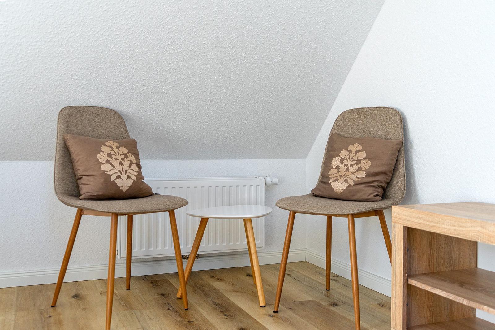 Im Schlafzimmer stehen ein Doppelbett, ein Kleiderschrank und ein weiterer Fernseher zur Verfügung, während das Duschbad mit Fön, Waschtrockner und einer ebenerdigen Dusche ausgestattet ist. Im Dachgeschoss befindet sich ein zusätzliches Schlafzimmer mit zwei Einzelbetten. Fliesen und Fußbodenheizung sorgen für Komfort im Obergeschoss, das Dachgeschoss ist mit Laminat ausgestattet. Kostenfreies WLAN ist ebenfalls verfügbar. Ein PKW-Stellplatz gehört zur Wohnung.