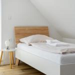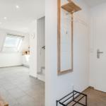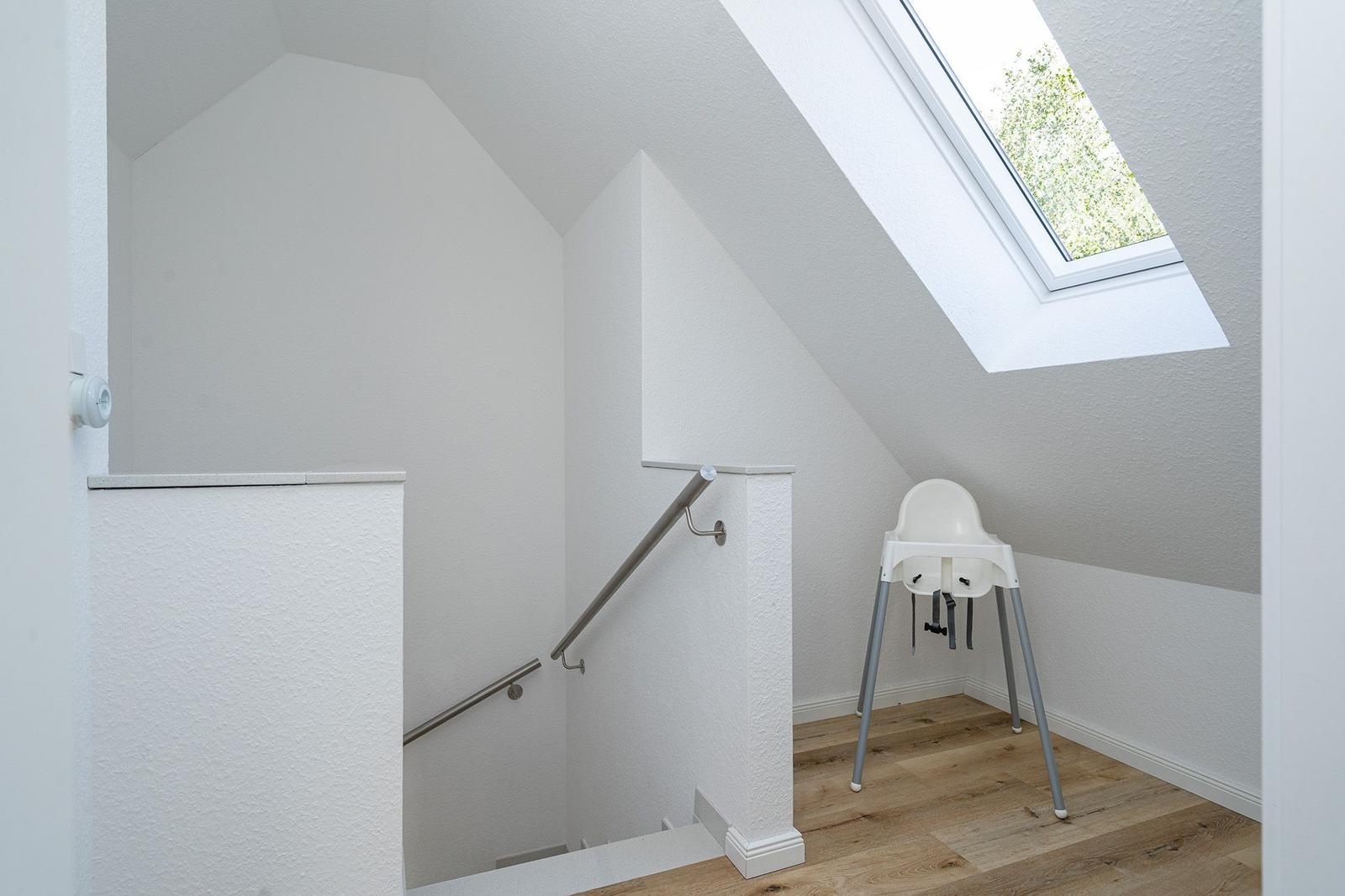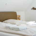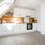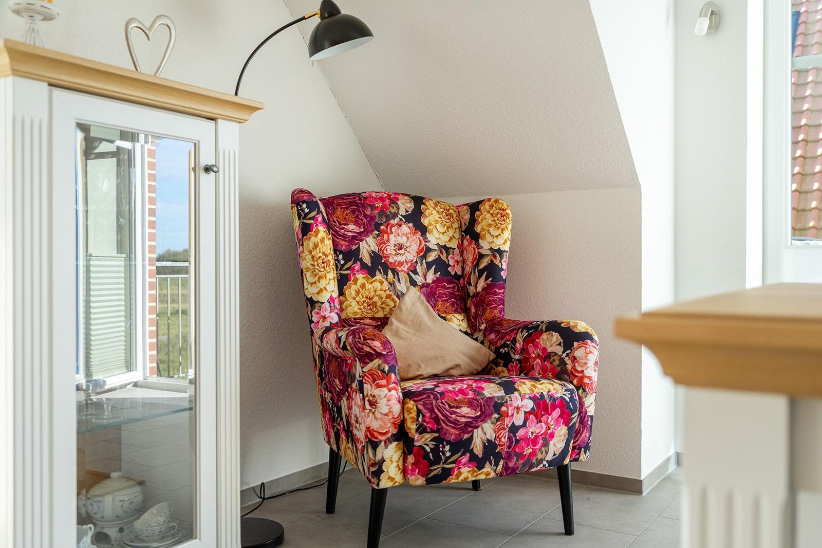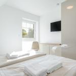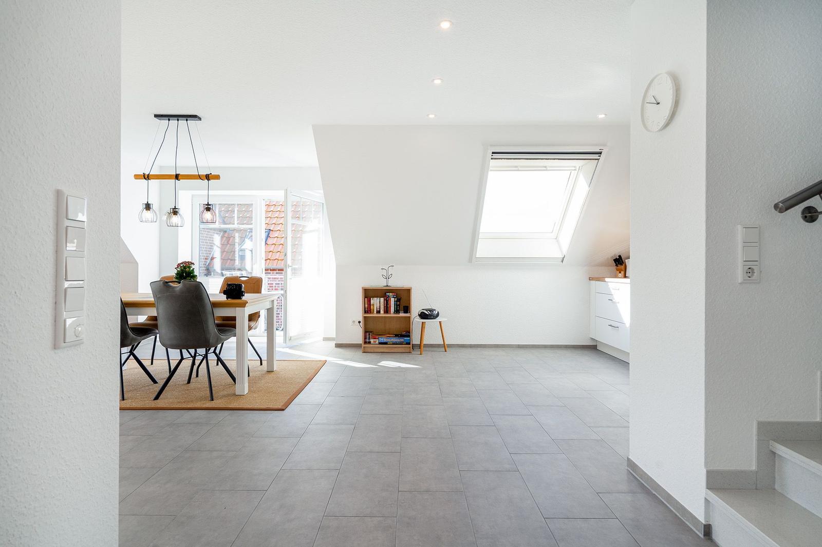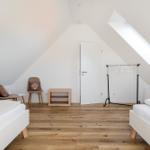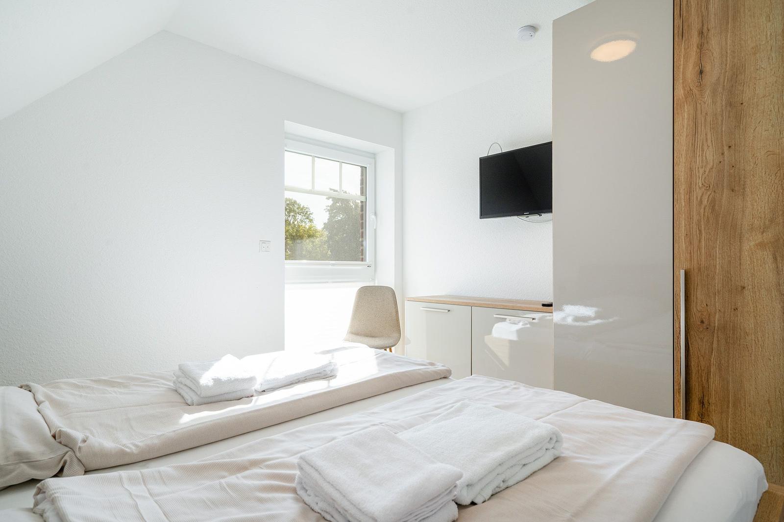 Im Schlafzimmer stehen ein Doppelbett, ein Kleiderschrank und ein weiterer Fernseher zur Verfügung, während das Duschbad mit Fön, Waschtrockner und einer ebenerdigen Dusche ausgestattet ist. Im Dachgeschoss befindet sich ein zusätzliches Schlafzimmer mit zwei Einzelbetten. Fliesen und Fußbodenheizung sorgen für Komfort im Obergeschoss, das Dachgeschoss ist mit Laminat ausgestattet. Kostenfreies WLAN ist ebenfalls verfügbar. Ein PKW-Stellplatz gehört zur Wohnung.