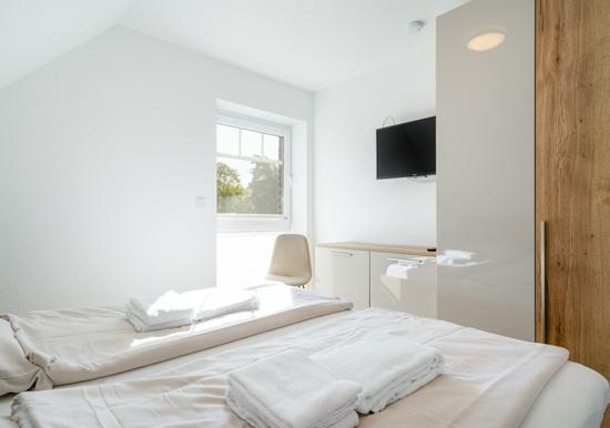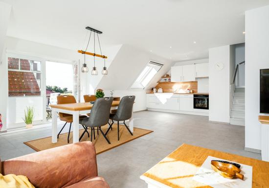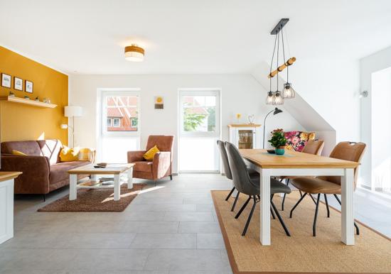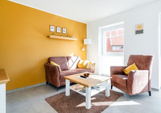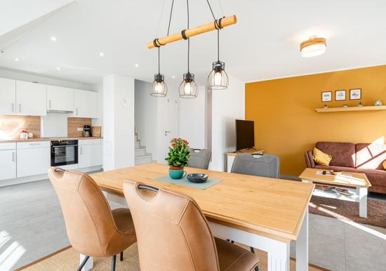 Die Ferienwohnung "Lütten Uttied" in Greetsiel überzeugt durch ihre hochwertige und geschmackvolle Einrichtung. Der lichtdurchflutete Wohnbereich bietet ein gemütliches L-Sofa, einen Sessel und einen großen Flachbildfernseher mit Netflix-Zugang sowie eine Bluetooth-Box. Die voll ausgestattete Küche beinhaltet unter anderem eine Spülmaschine, Backofen, Kühlschrank mit Gefrierfach und Kaffeemaschinen. Die Wohnung verfügt über zwei Schlafzimmer: eines mit Doppelbett und eines mit zwei Einzelbetten, beide ausgestattet mit Kleiderschrank und komfortablen Matratzen. Das große, barrierefreie Badezimmer bietet eine offene Dusche, einen elektrischen Handtuchheizkörper und ein unterfahrbares Waschbecken. Alle Türen sind rollstuhlgerecht. Ein Abstellraum mit Waschmaschine sowie kostenloses WLAN sind ebenfalls vorhanden. Die gesamte Wohnung ist mit Fußbodenheizung ausgestattet und ein Hund ist herzlich willkommen.