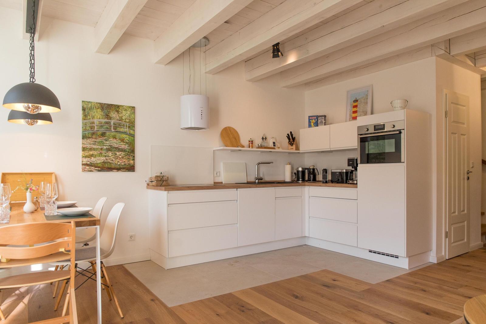 Die Ferienwohnung „Klaar Kimming“ in Rysum bietet einen einladenden Außenbereich, der ideal für entspannte Stunden im Freien ist. Die großzügige Terrasse mit verstellbaren Gartenstühlen und einem Tisch lädt dazu ein, die frische Luft und die Aussicht auf die umliegende Wiese zu genießen. Hier können Gäste den Sonnenuntergang beobachten oder gesellige Grillabende am Weber Holzkohlegrill verbringen. Zusätzlich ist ein kleiner Garten mit einem externen Gartenhäuschen vorhanden, das direkt neben den PKW-Stellplätzen liegt, und ein großer Gartenbereich, der besonders für Kinder zum Spielen geeignet ist. Die gemeinschaftlich nutzbaren Außenanlagen ermöglichen es, Zeit im Freien zu verbringen und die Natur der Ostfriesischen Landschaft zu genießen. Die Lage in ruhiger Umgebung, nur etwa 1 km von der Nordsee entfernt, bietet zudem vielfältige Freizeitmöglichkeiten wie Radfahren und Wandern.