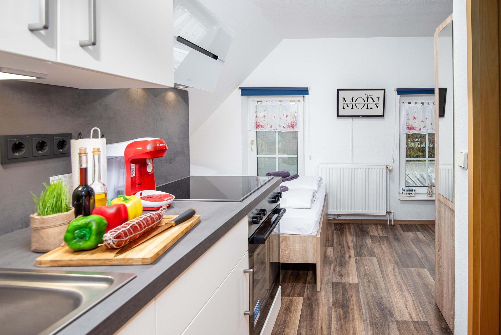 Die Ferienwohnung Krabbe bietet ihren Gästen einen einladenden Außenbereich, der gemeinschaftlich genutzt werden kann. Der idyllische Garten der Alten Brauerei lädt zum Verweilen ein und ermöglicht entspannte Stunden im Freien. Hier können die Gäste die Sonne genießen oder einfach die Ruhe der Umgebung erleben. Für kulinarische Erlebnisse steht die gemütliche Bäckerei im selben Gebäude zur Verfügung, wo frische Brötchen für ein leckeres Frühstück vorbestellt werden können. Zudem stehen den Gästen eigene Parkplätze direkt an der Unterkunft zur Verfügung, um eine unkomplizierte Ankunft und Abreise zu gewährleisten. Die Ferienwohnung selbst, mit ihrem charmanten Charakter auf 25 m², bietet den idealen Rückzugsort, um die besondere Atmosphäre der Krummhörn zu genießen.