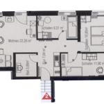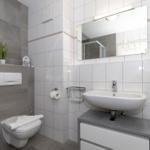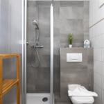 Das Badezimmer ist mit einer Dusche, einem WC und einem Waschbecken mit Unterschrank ausgestattet.