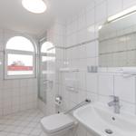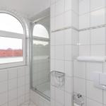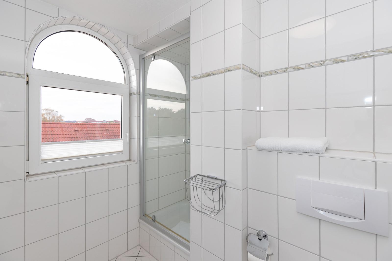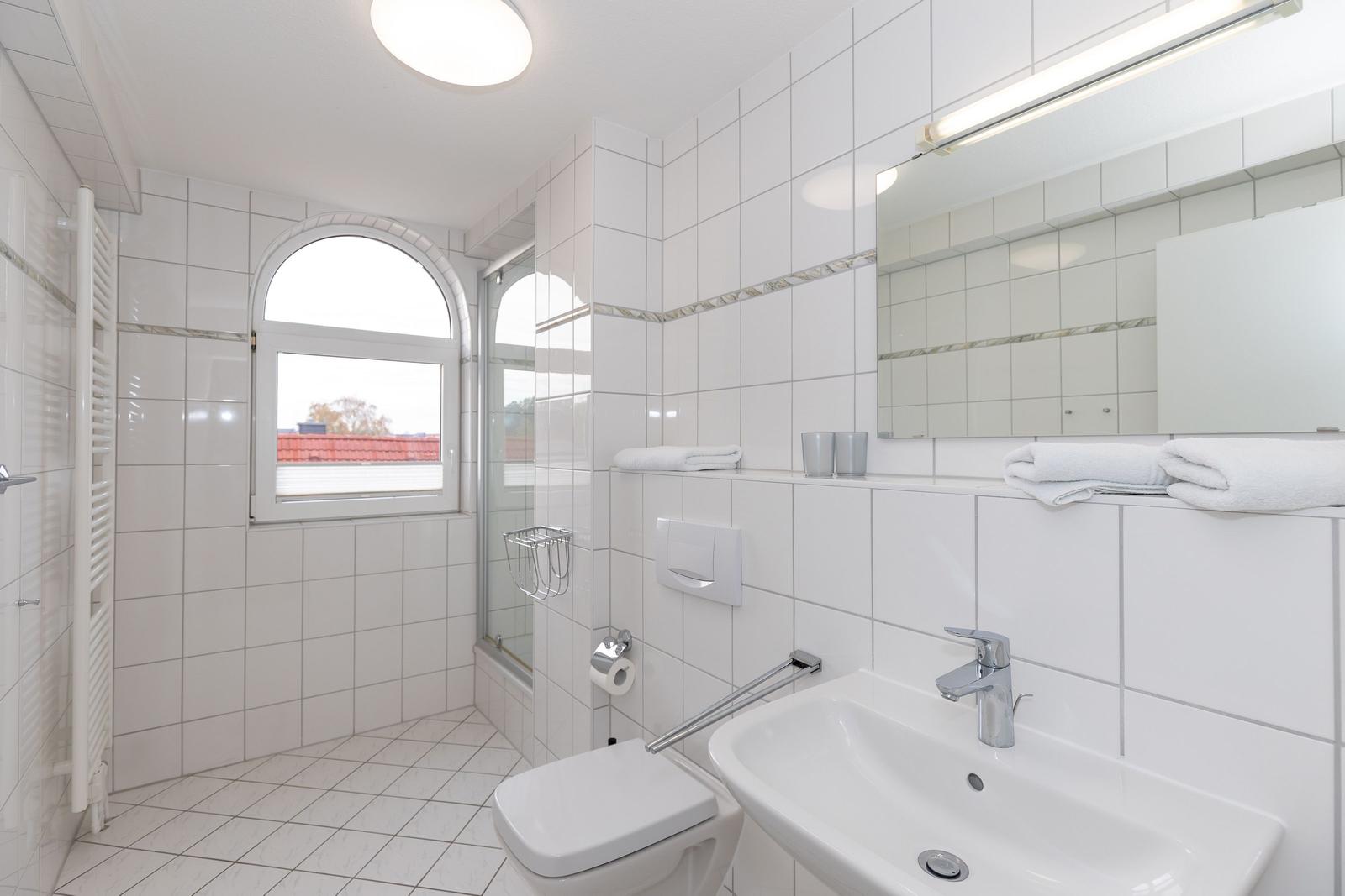 Das großzügige, hell geflieste Badezimmer mit Tageslicht ist mit einer Dusche, einem WC, einem Waschbecken und einer Handtuchheizung ausgestattet. Ausreichend Platz für Kosmetika finden Sie auf der Ablagefläche des Spiegels.