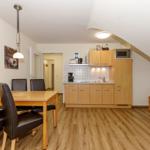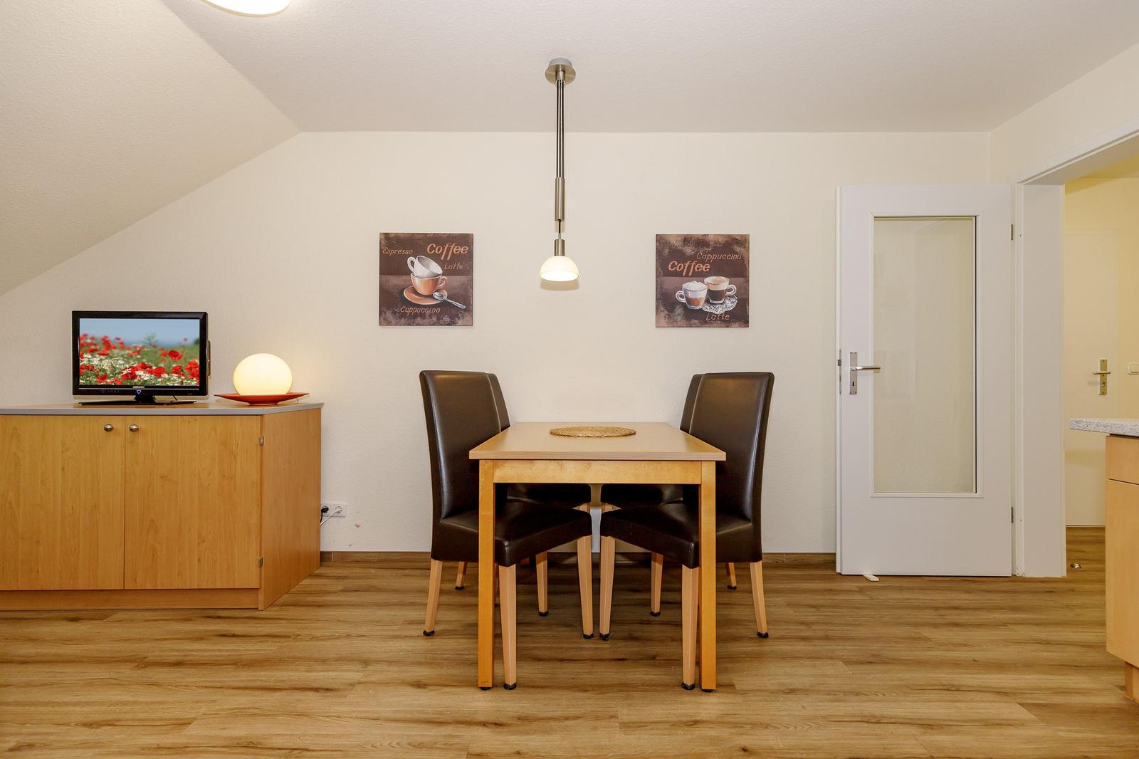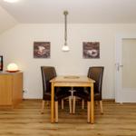 An den Wohnbereich grenzt der Esstisch für vier Personen. Alle Familienmitglieder haben hier ausreichend Platz für die gemeinsamen Mahlzeiten.