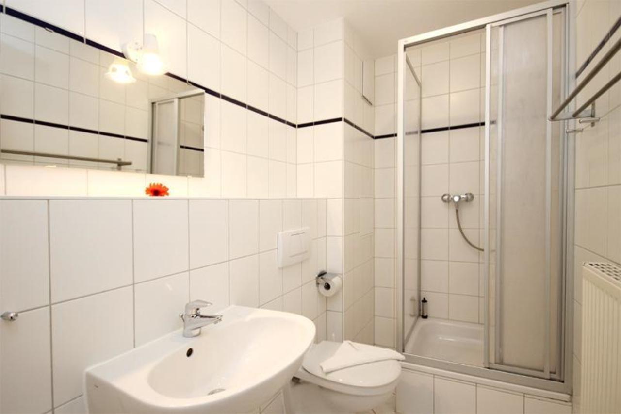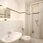 Im Badezimmer befinden sich eine Dusche, ein Waschbecken und ein WC.