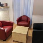 Im offenen Wohnbereich finden Sie 3 bequeme Ledersessel zum gemütlichen Beisammensitzen, zu Ihrer Unterhaltung stehen Ihnen ein Flachbild-Fernseher und eine kleine Stereoanlage zur Verfügung.