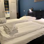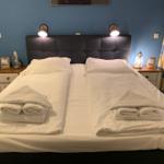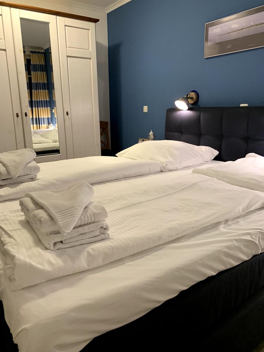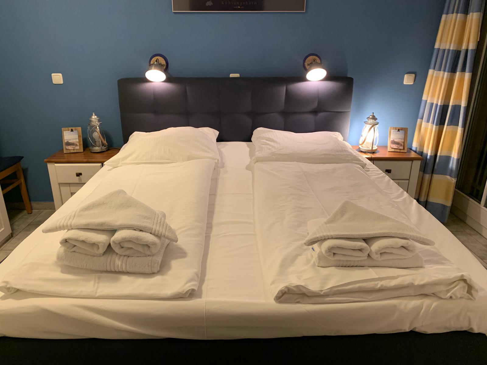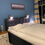 Das Elternschlafzimmer ist mit einem Boxspringbett, zwei Nachttischen mit guter Lesebeleuchtung und einem Kleiderschrank ausgestattet.