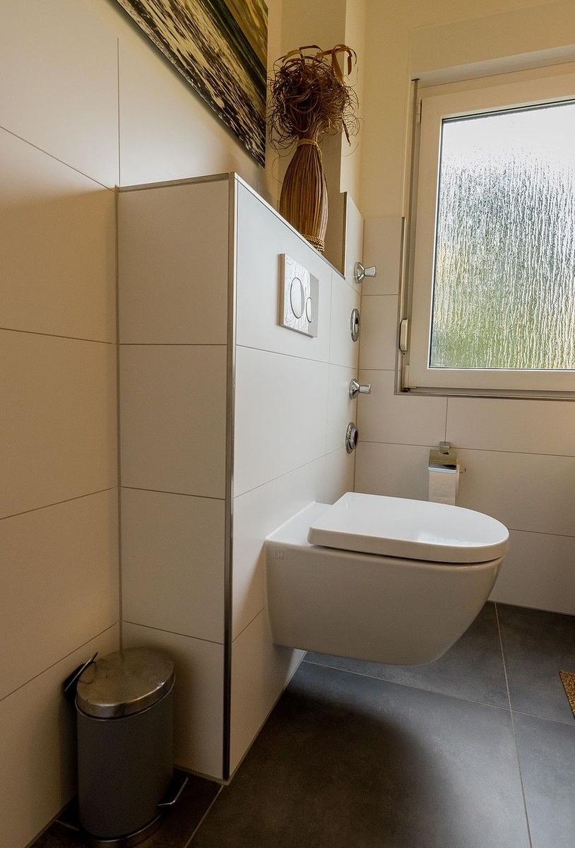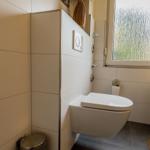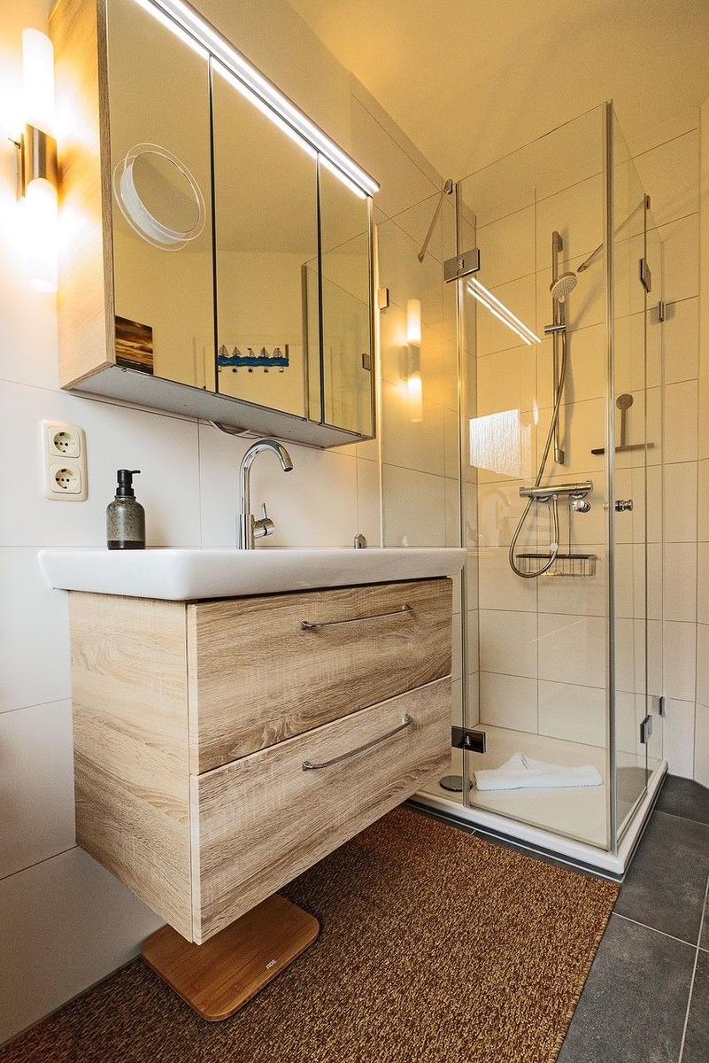 Das Badezimmer verfügt über eine Dusche, ein WC sowie ein Waschbecken mit Unterschrank