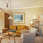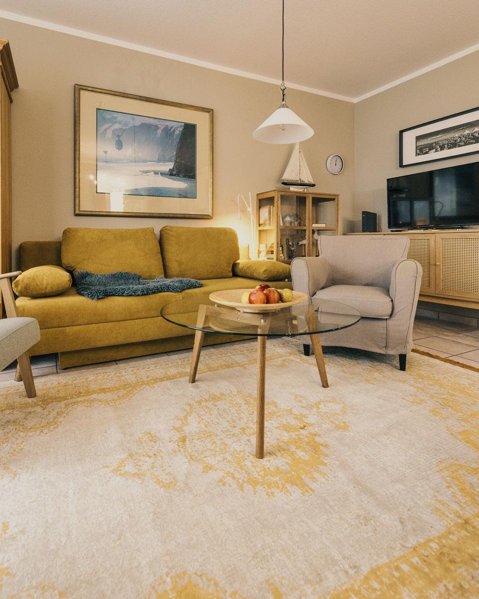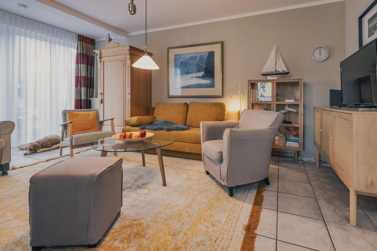 Alle Einrichtungsgegenstände im Wohnbereich strahlen Komfort und Charme aus. Das bequeme Sofa kann mit wenigen Handgriffen zu einer Schlafcouch für 2 Personen umfunktioniert werden. Ein Relax-Sessel sorgt für Entspannung pur!.