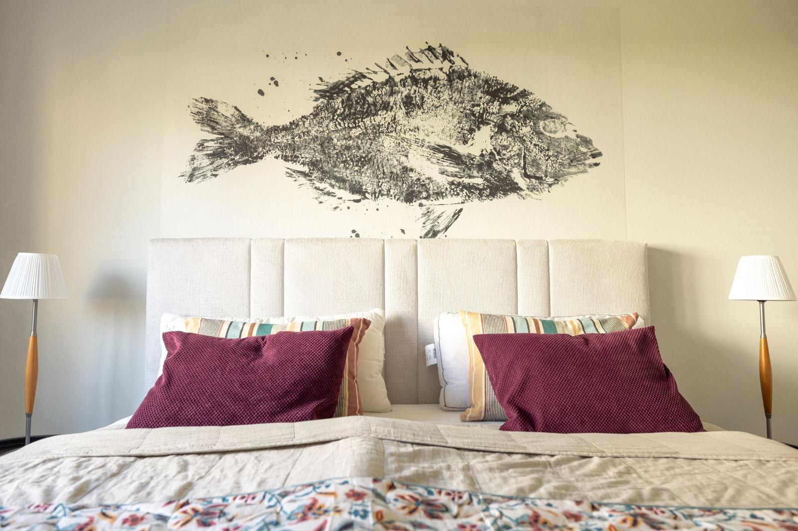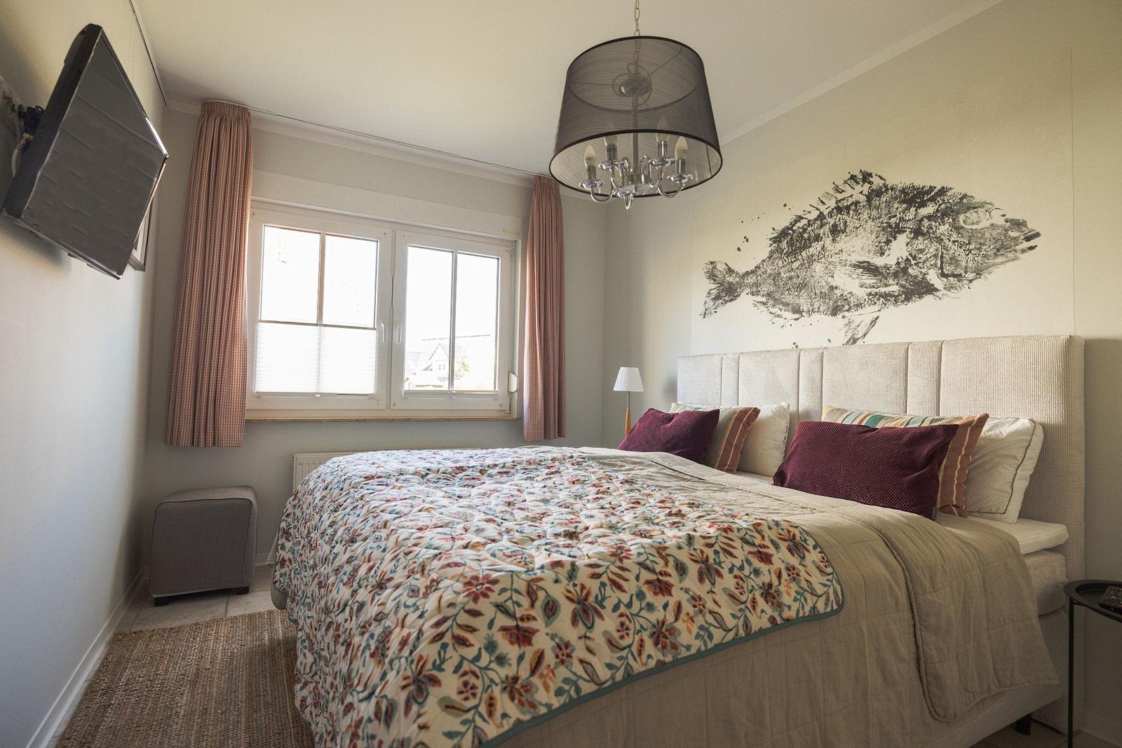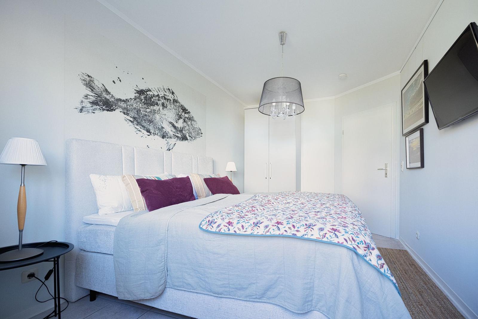 Die Wohnung bietet ein separates, sehr gemütlich und komfortabel möbliertes Schlafzimmer, das mit einem Doppelbett und einem zweiten Fernseher ausgestattet ist.