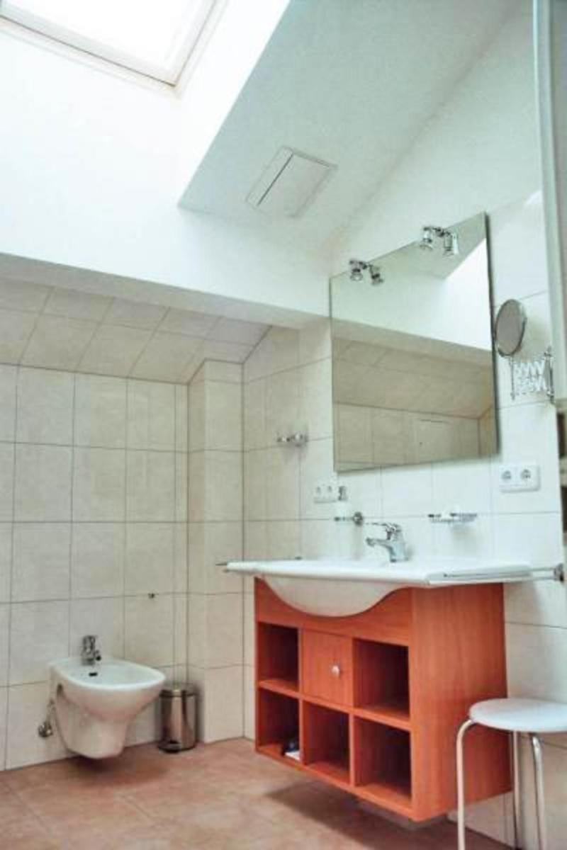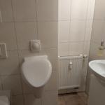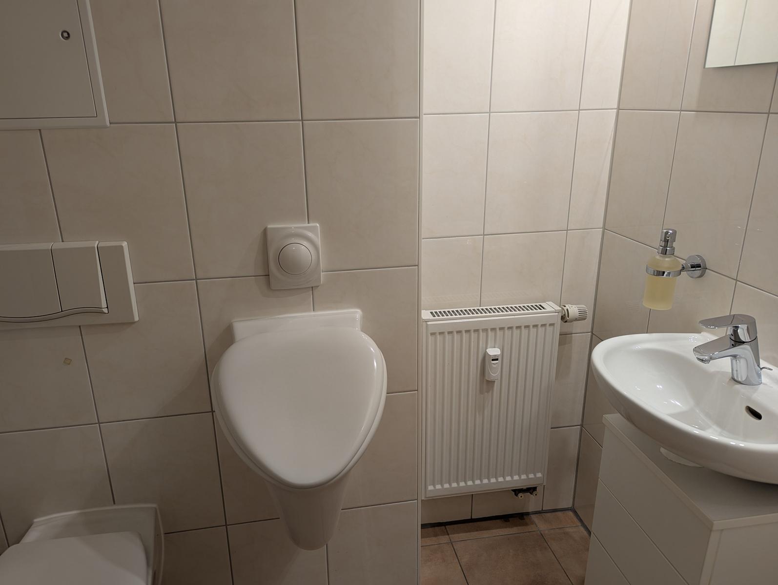 Neben dem hell gefliesten und lichtdurchfluteten Bad mit Dusche, WC, Bidet, Waschtisch und Haartrockner im Obergeschoss finden Sie auch ein Gäste-WC (mit zusätzlichem Urinal) im Untergeschoss der Wohnung.