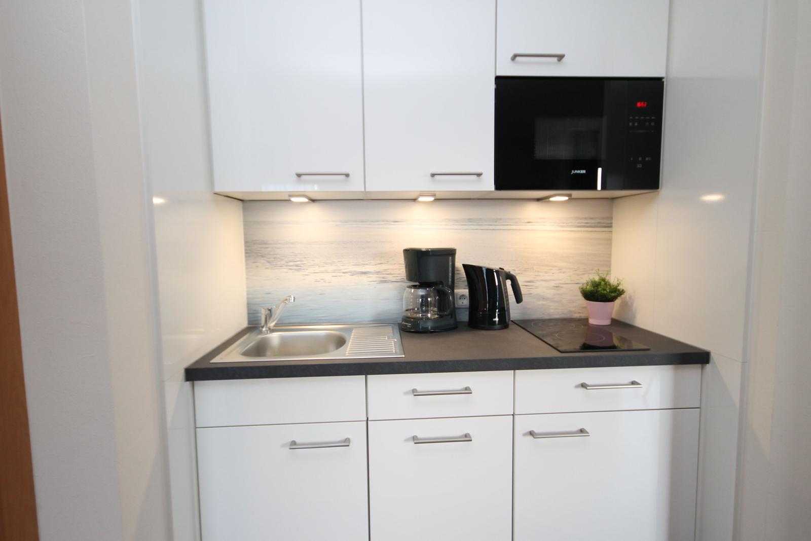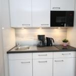An den Wohnbereich grenzt die kleine Küchenzeile, welche voll ausgestattet ist. Hier finden Sie einen 2-Platten-Herd, Mikrowelle, Geschirrspüler, Toaster, Kaffeemaschine, Wasserkocher und natürlich genügend Geschirr.
