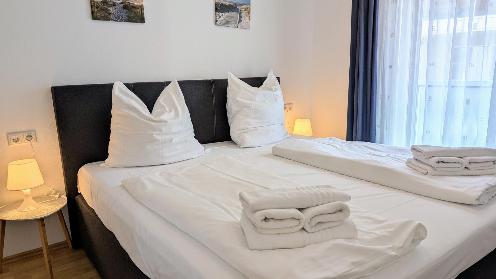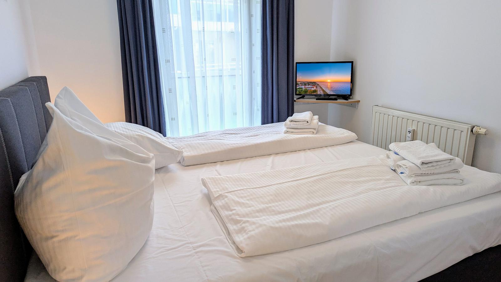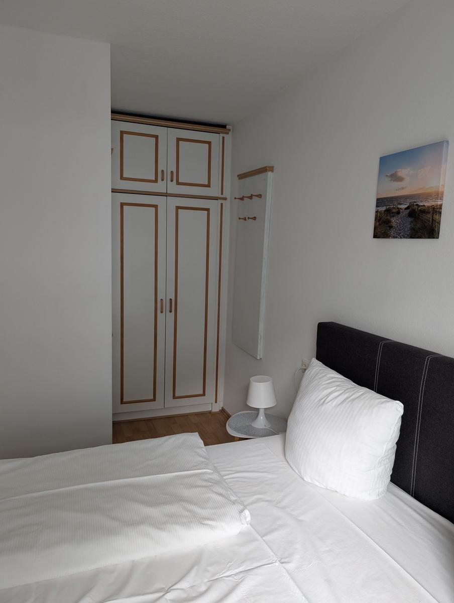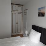 Das separate Schlafzimmer ist mit einem bequemen Doppelbett eingerichtet. Einem erholsamen Schlaf steht hier nichts im Wege. Ein geräumiger Kleiderschrank für Ihre Urlaubsgarderobe steht Ihnen ebenfalls zur Verfügung.