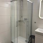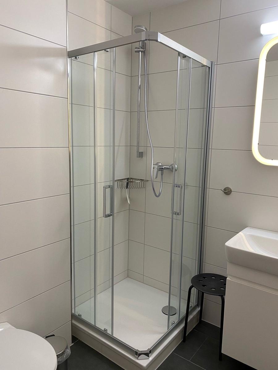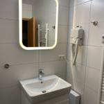 Das Badezimmer ist mit Dusche, WC, Handtuchheizkörper, Waschbecken mit Unterschrank und Föhn ausgestattet.