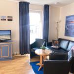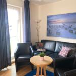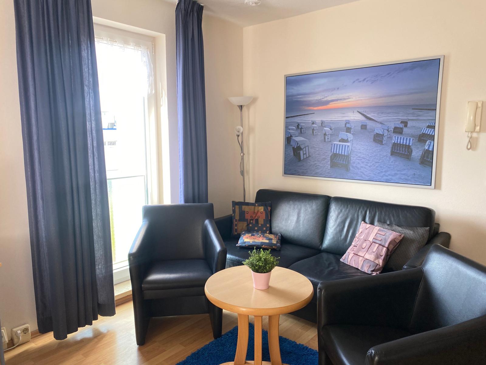 Der komfortable Wohnbereich ist mit einer Sofa- und Sesselecke eingerichtet. Das neue Ledersofa kann als zusätzliche Schlafgelegenheit für 2 Personen genutzt werden.