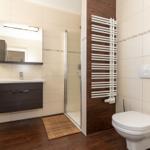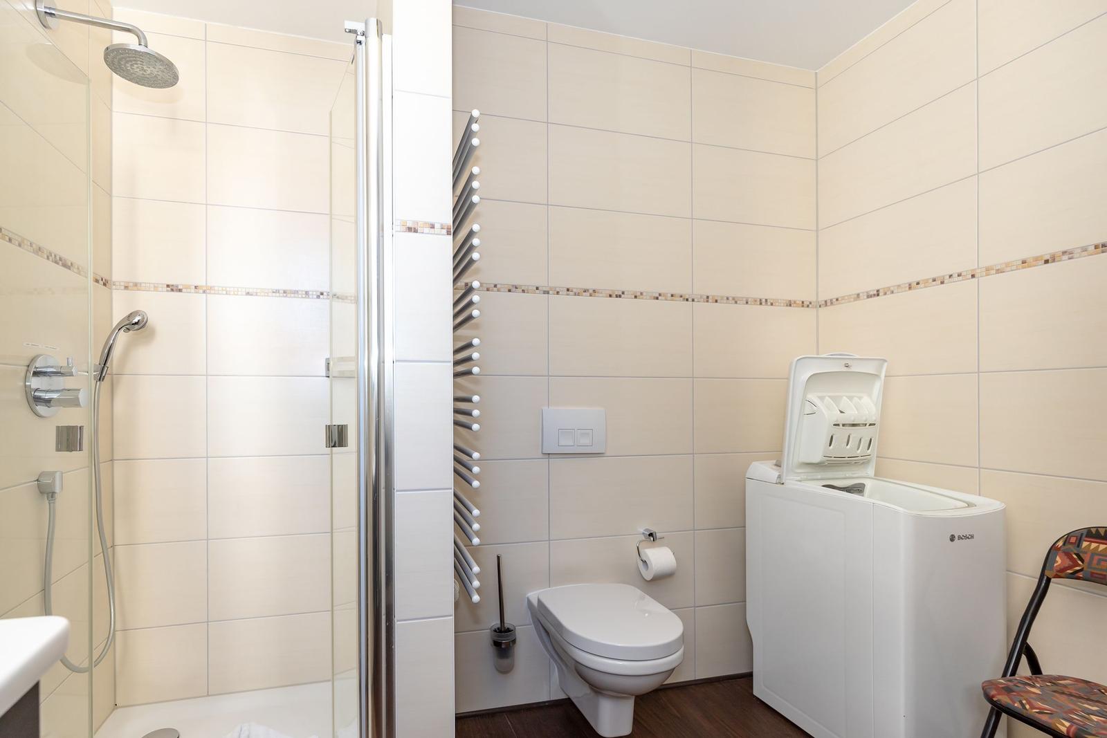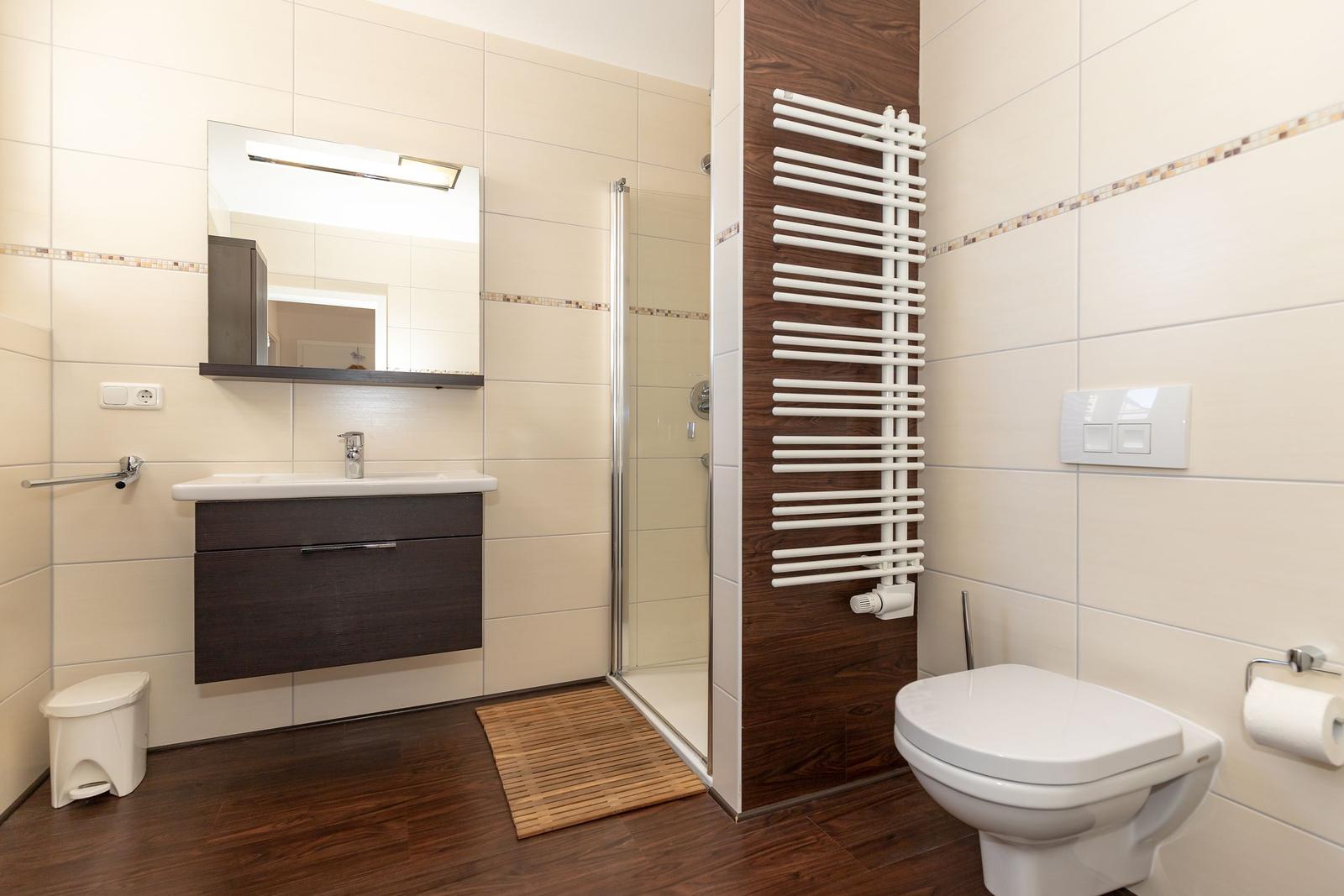 Das hochwertige Badezimmer verfügt über ein Fenster und ist mit einer Dusche, einem WC, einem Waschtisch und einem beheizbaren Handtuchtrockner ausgestattet.