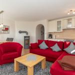 Der Wohnbereich lädt mit dem großzügigen Sofa zum gemeinsamen gemütlichen Beisammensein ein, ein Flachbildschirm-Gerät sorgt für Ihre abendliche Unterhaltung. Der Kamin (für Holz bitte selbst sorgen) sorgt an kühlen Tagen für wohlige Wärme.
