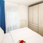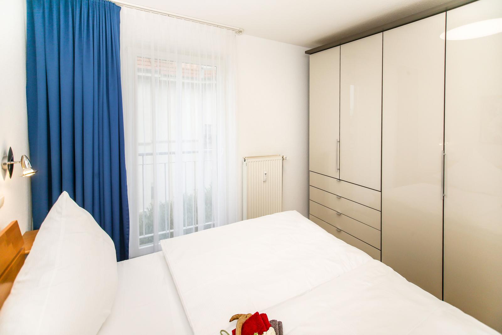 Das Schlafzimmer verfügt über ein Doppelbett mit hochwertigen Matratzen und einen geräumigen Kleiderschrank für Ihre Urlaubsgarderobe.