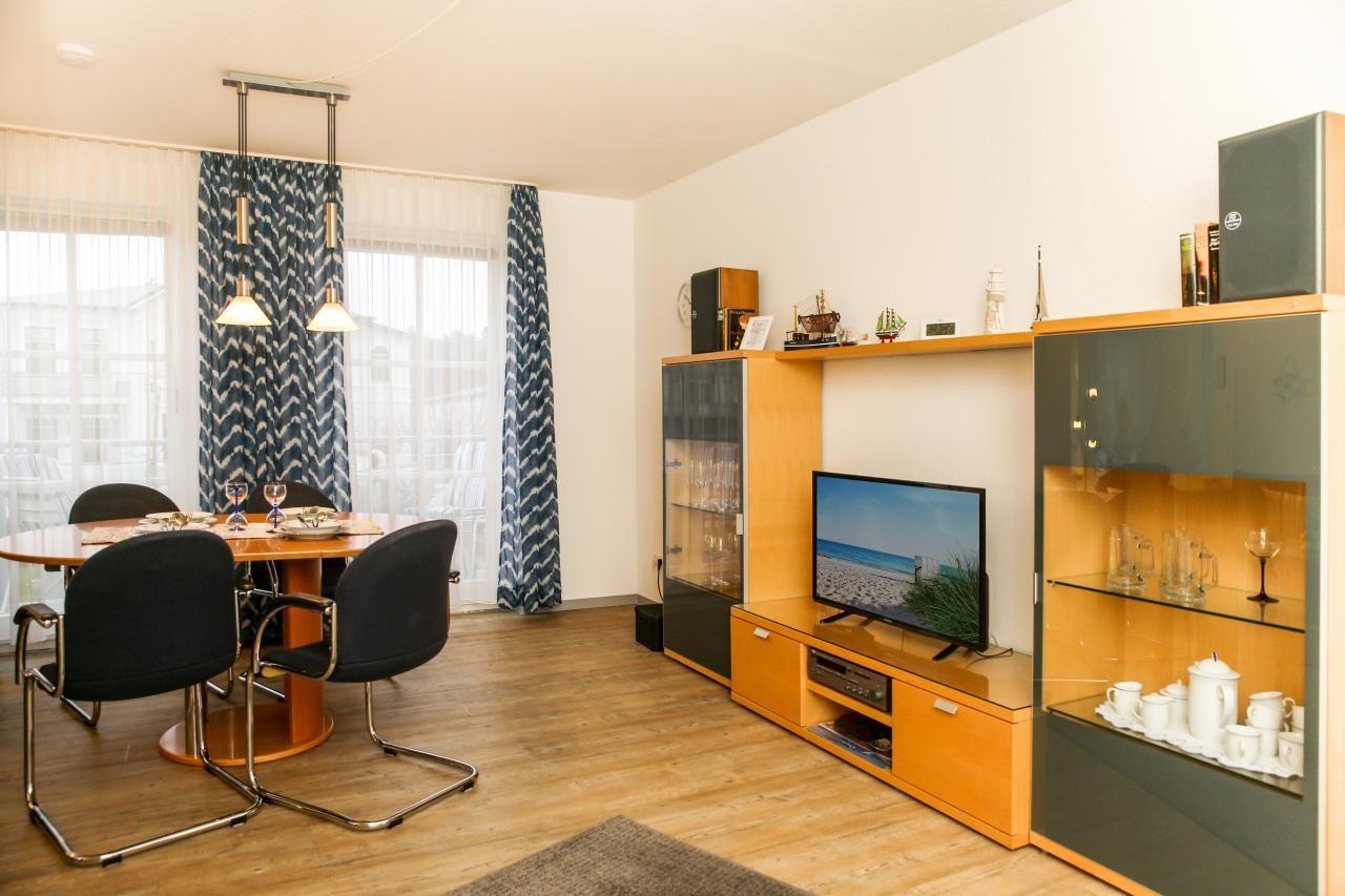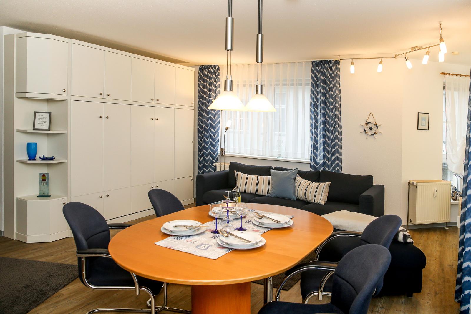 Der helle Wohnbereich mit Esstisch, großem Sofa mit Hocker, LCD-TV und Stereo-Anlage wurde mit hochwertigem Bodenbelag ausgestattet. Das neue Doppelschrank-Klappbett lässt sich ganz einfach für die 3. und 4. Schlafmöglichkeit ausklappen.