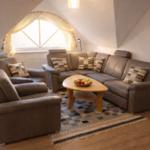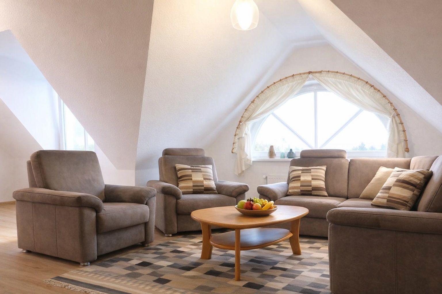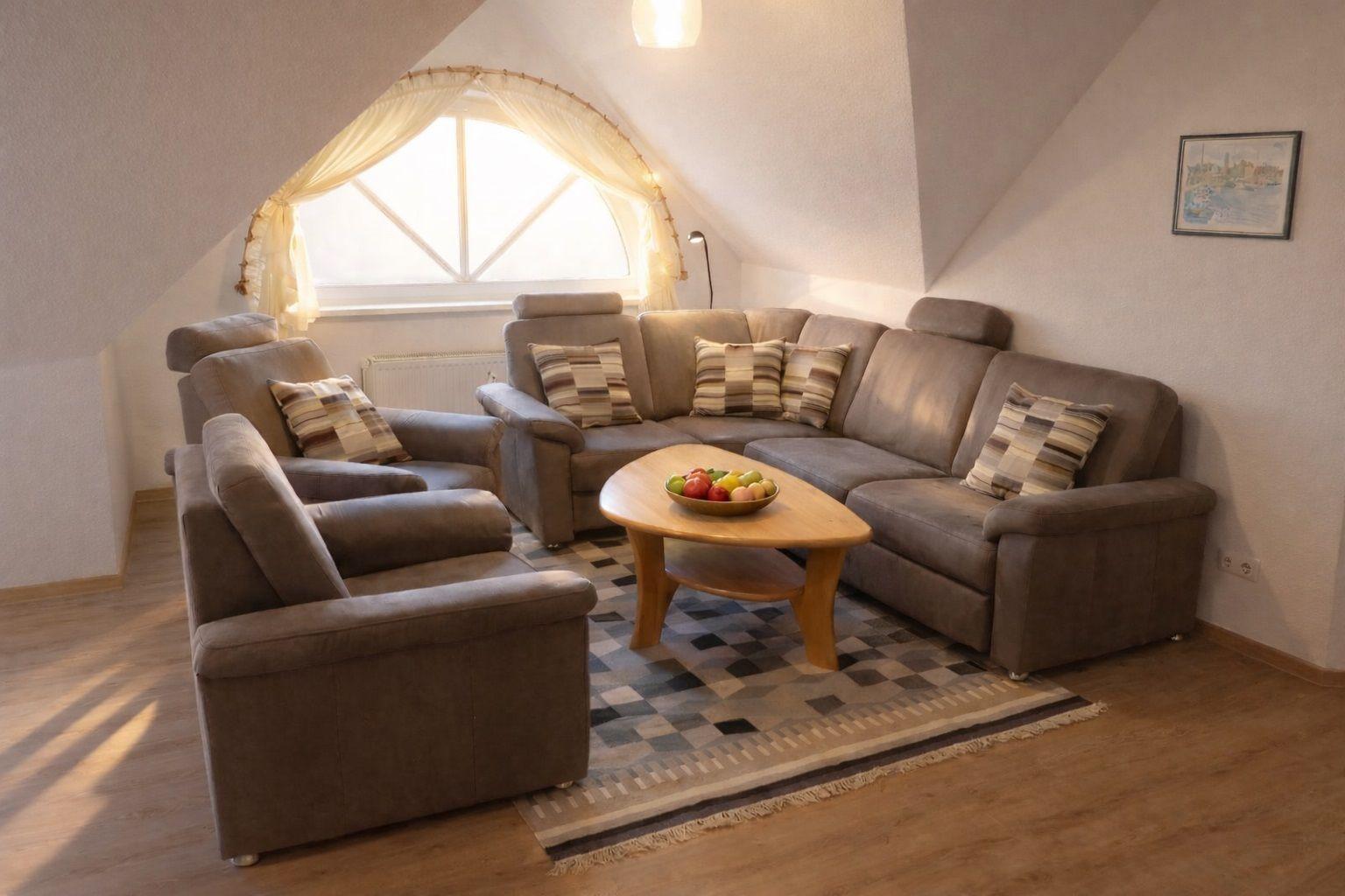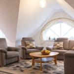 Der Wohnbereich strahlt Wärme und Komfort aus und ist mit einer Schlafcouch und zwei gemütlichen Sesseln eingerichtet. Die Couch ist ausziehbar und dient als Schlafmöglichkeit für 1 Person. Für Ihre abendliche Unterhaltung sorgen ein Flachbild-TV sowie ein CD-Player.