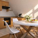 Der Küchenbereich besteht aus einem Esstisch, an die alle Familienmitglieder ihre Mahlzeiten einnehmen können, sowie einer voll ausgestatteten Küche, die alle Bequemlichkeiten einer modernen Küche beinhaltet.
