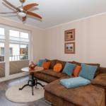 Der offene Wohnbereich ist mit einem bequemen Sofa, moderner Deko und einem Deckenventilator ausgestattet. Hier finden Sie Erholung nach einem ereignisreichen Urlaubstag.