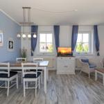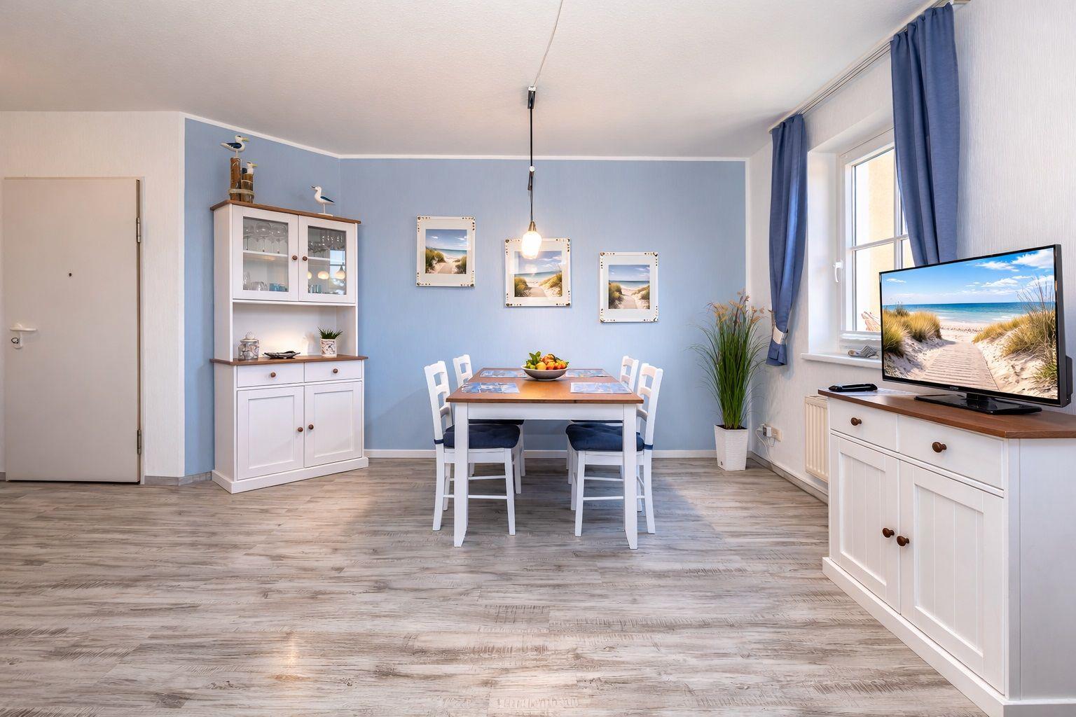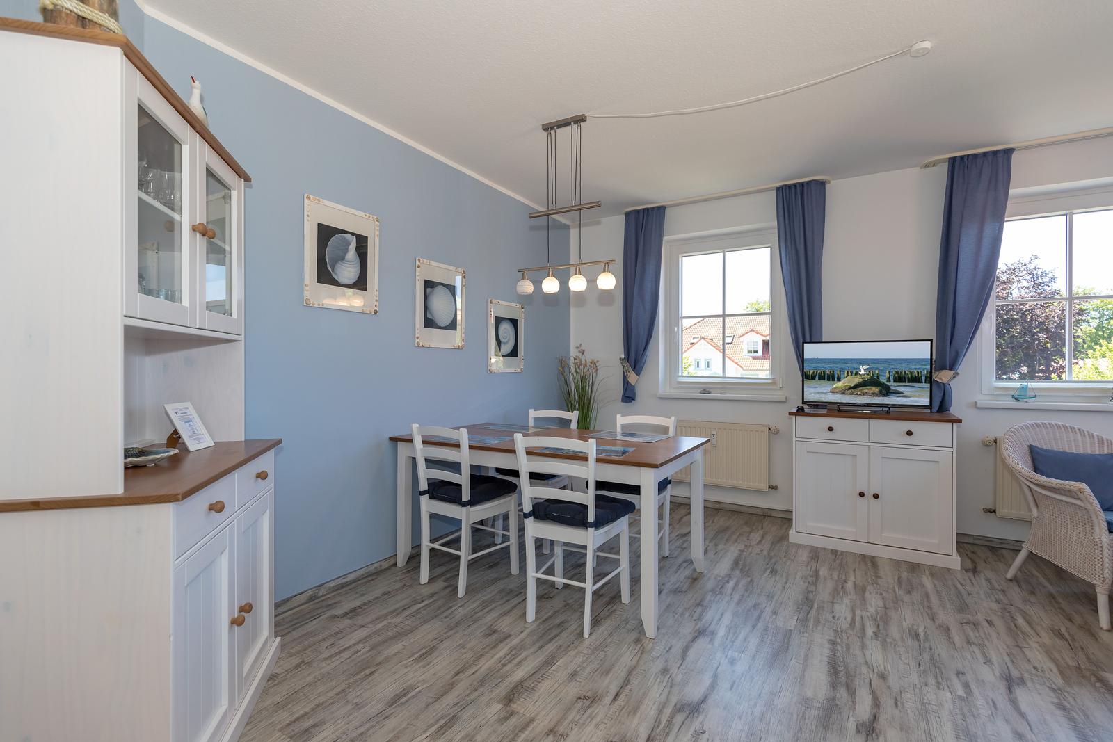 Vom Eingangsbereich erschließt sich Ihnen der Wohn- und Essbereich. Der große Esstisch für 4 Personen und die großzügige Sitzgruppe in liebevoll dekoriertem Ambiente macht diesen Raum zu einem echten Treffpunkt für die ganze Familie.