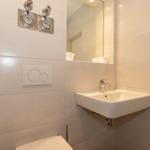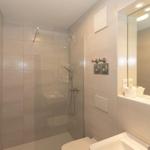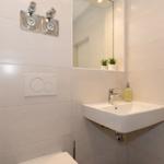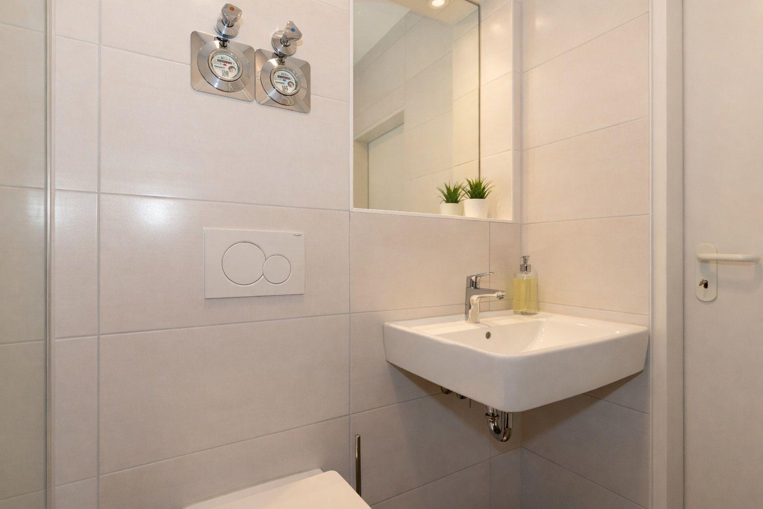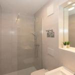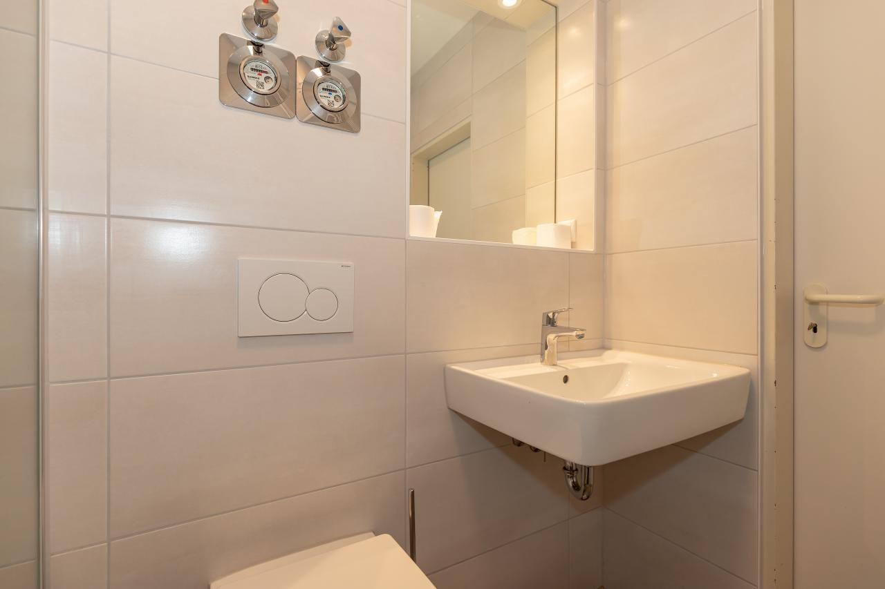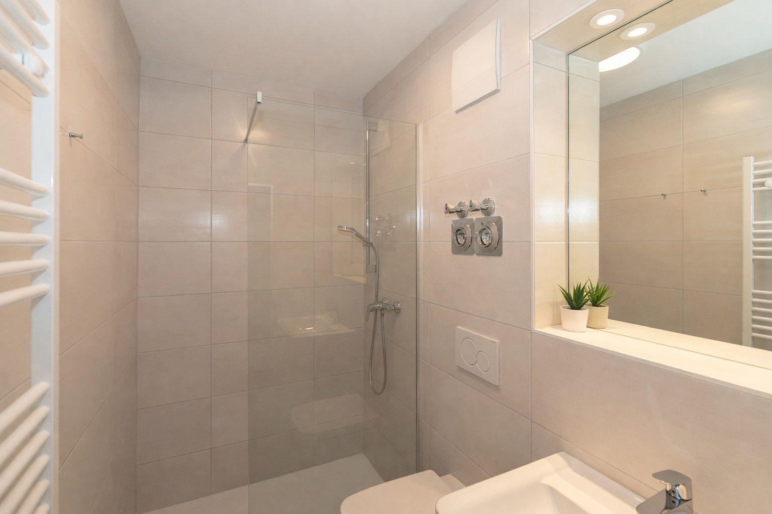 Das Bad verfügt über eine Dusche, ein WC, ein Waschbecken mit Unterschrank, einen Handtuchheizkörper, einen beleuchteten Spiegel, Tritthocker und viele Ablagemöglichkeiten.