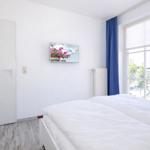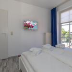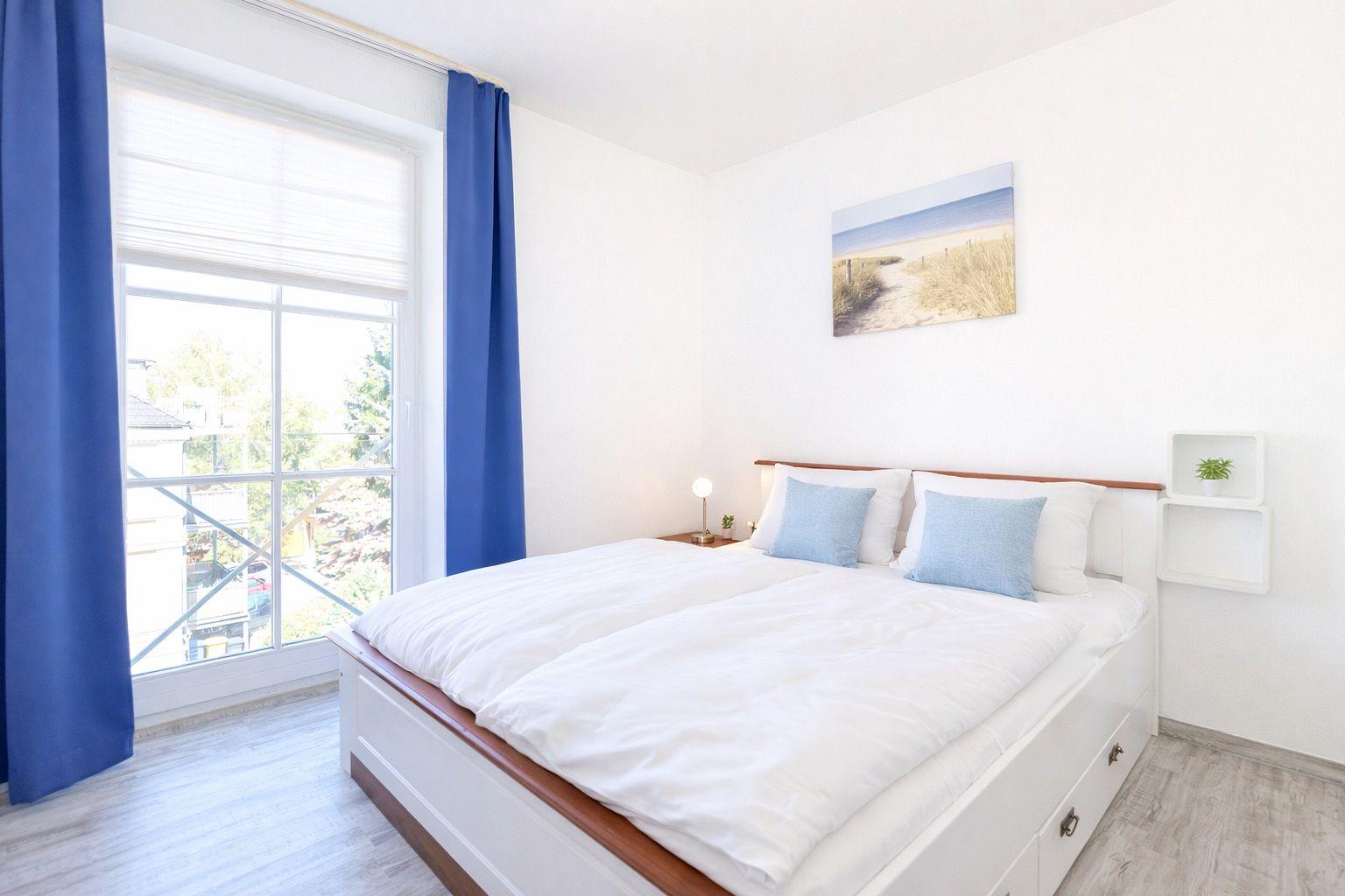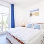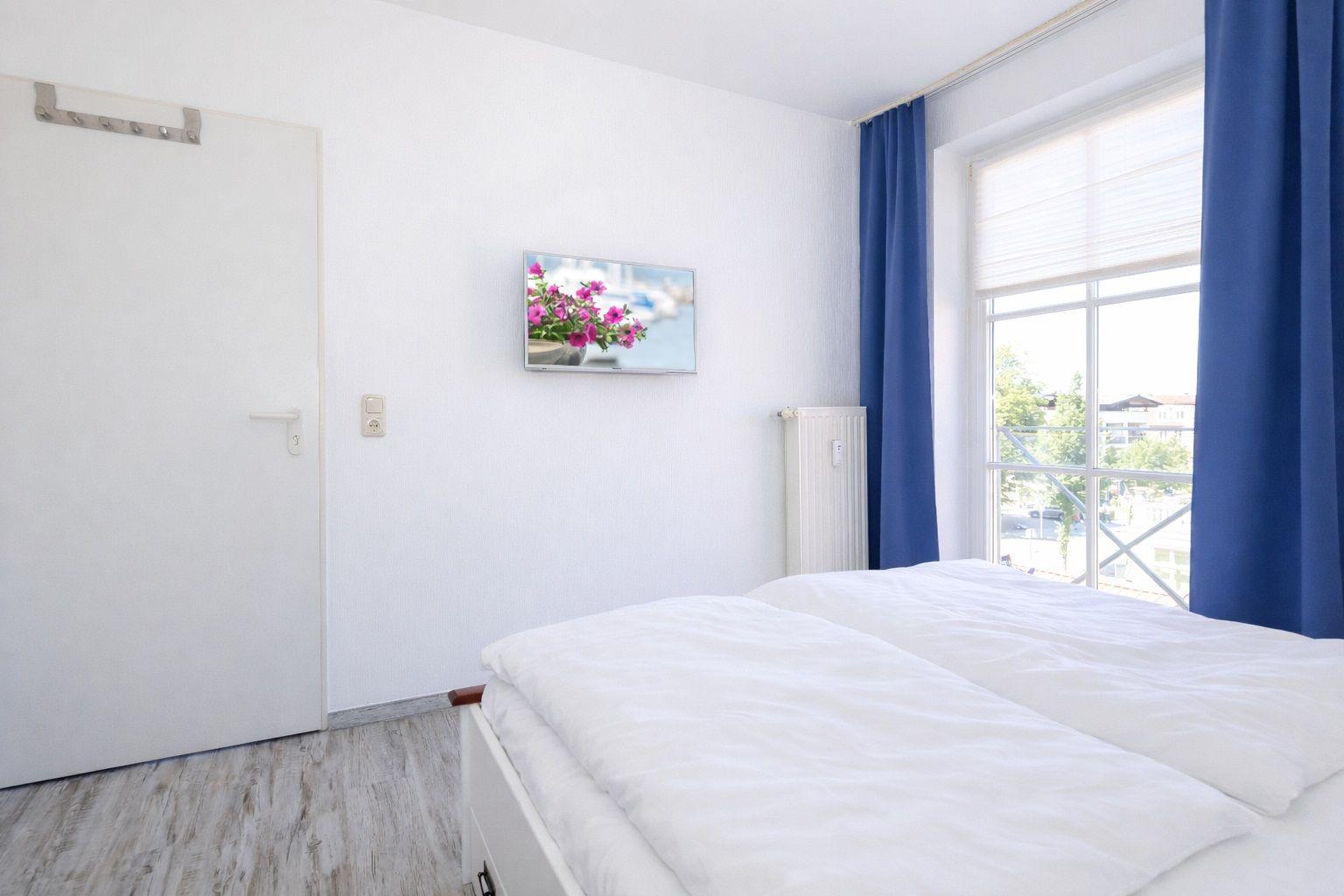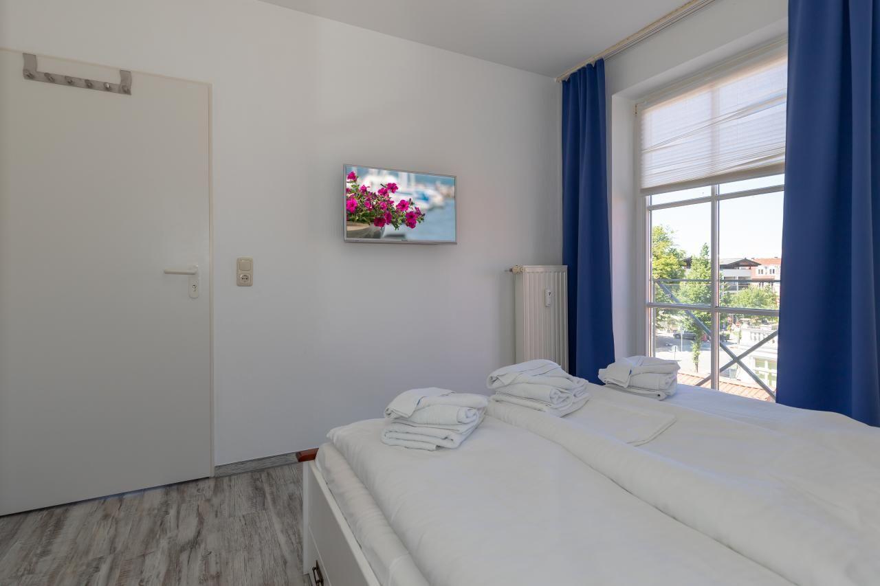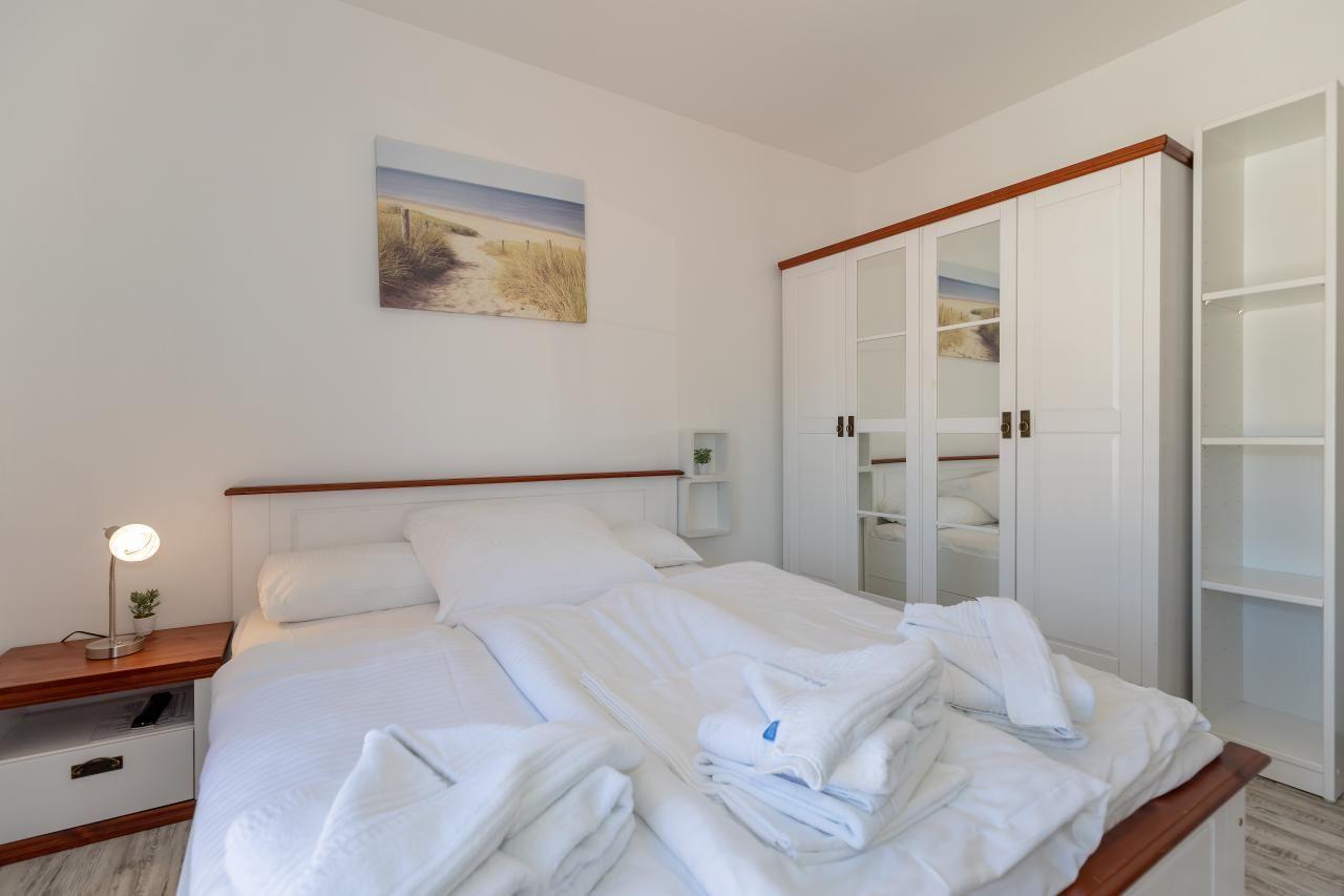 Das helle Schlafzimmer mit einem französischen Balkon verfügt über ein Doppelbett von 160 x 200 cm, einen großzügigen Schrank und ausreichend Decken und Kopfkissen für 4 Personen. Ein zweiter TV steht Ihnen hier zur Verfügung. Was kann man sich mehr wünschen, als bei sauberer und frischer Ostseeluft die Nacht zu verbringen.