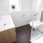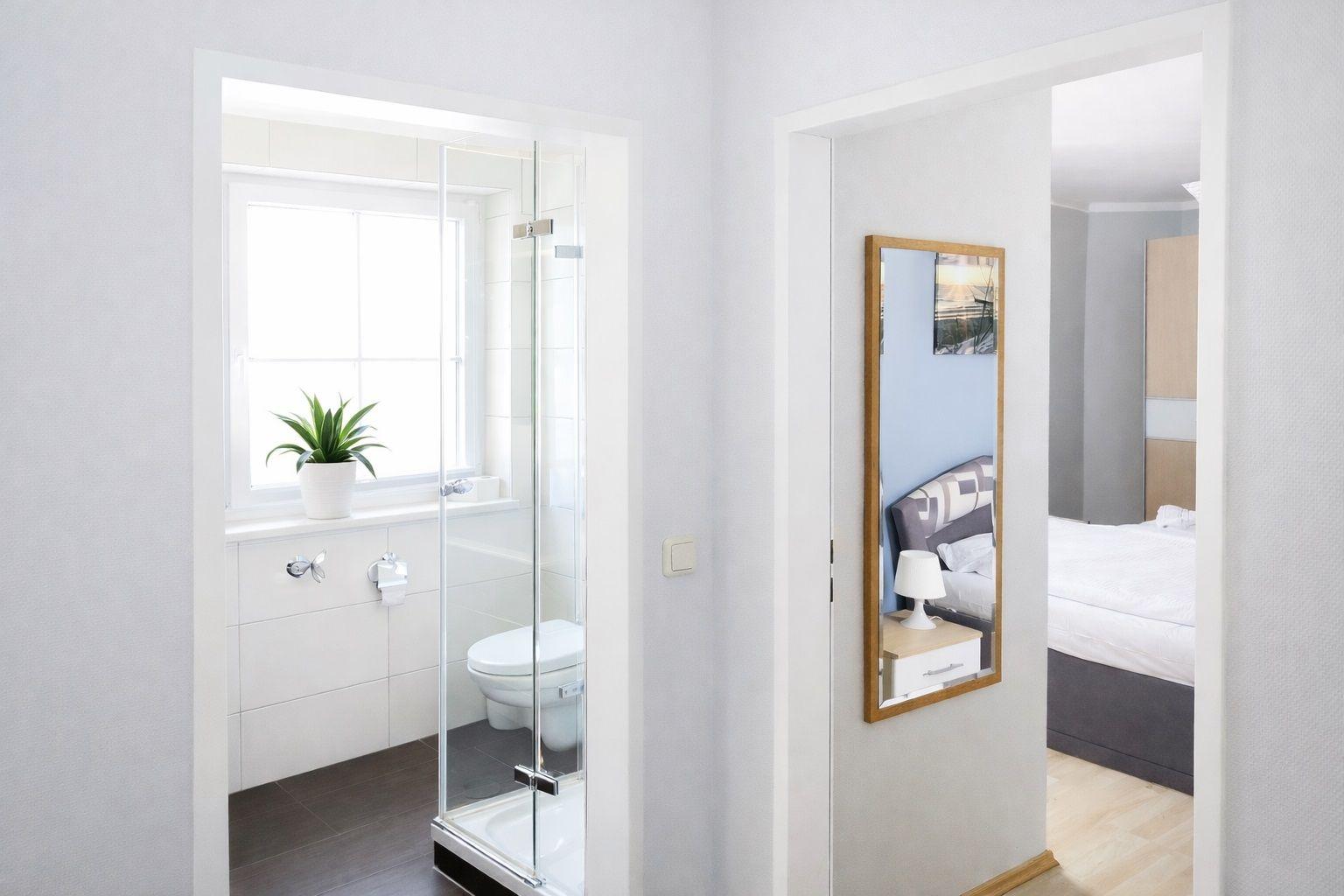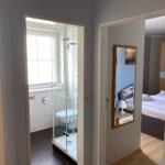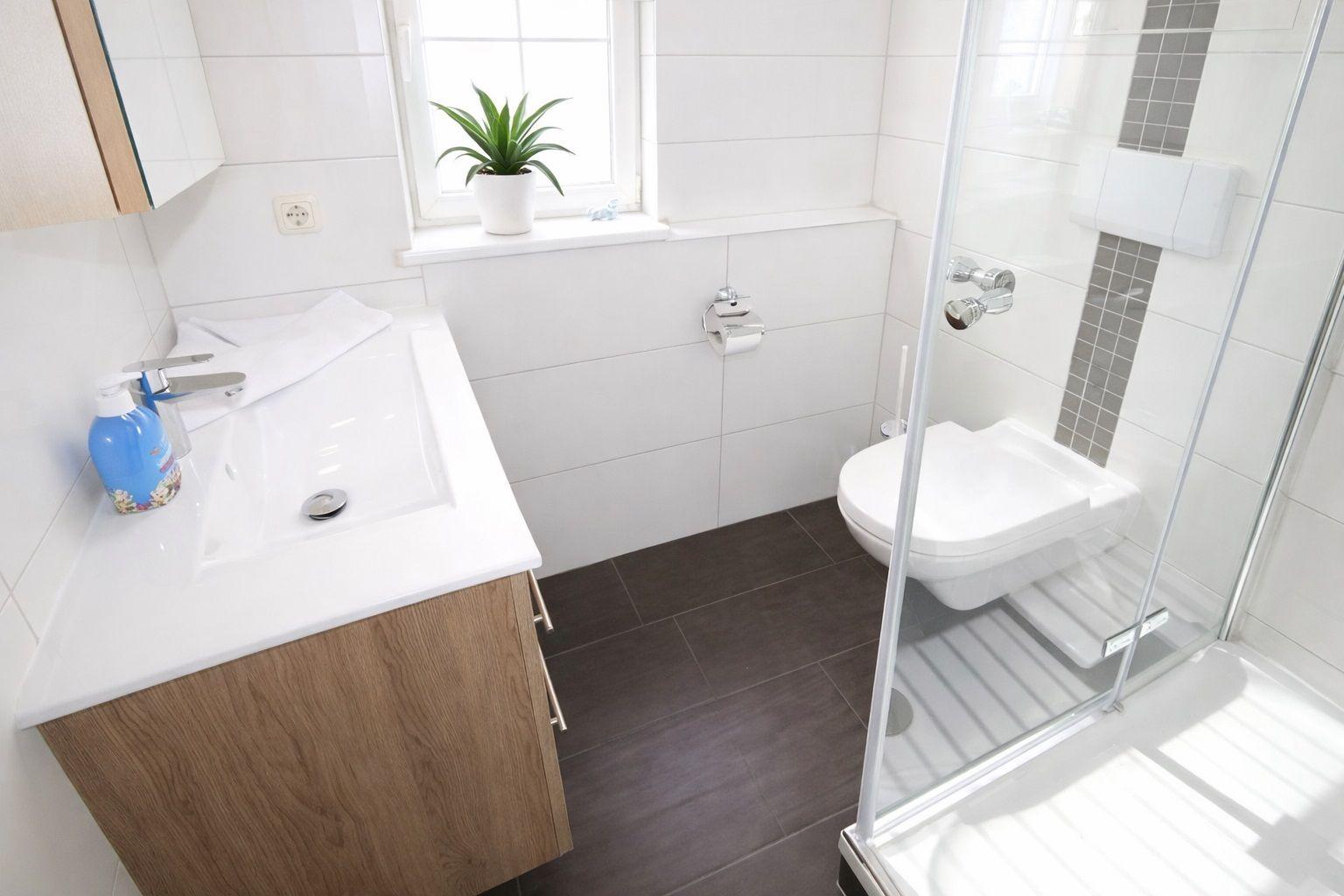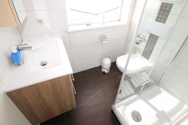 Das Badezimmer ist mit Dusche und WC ausgestattet.