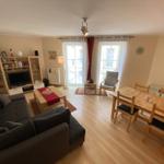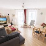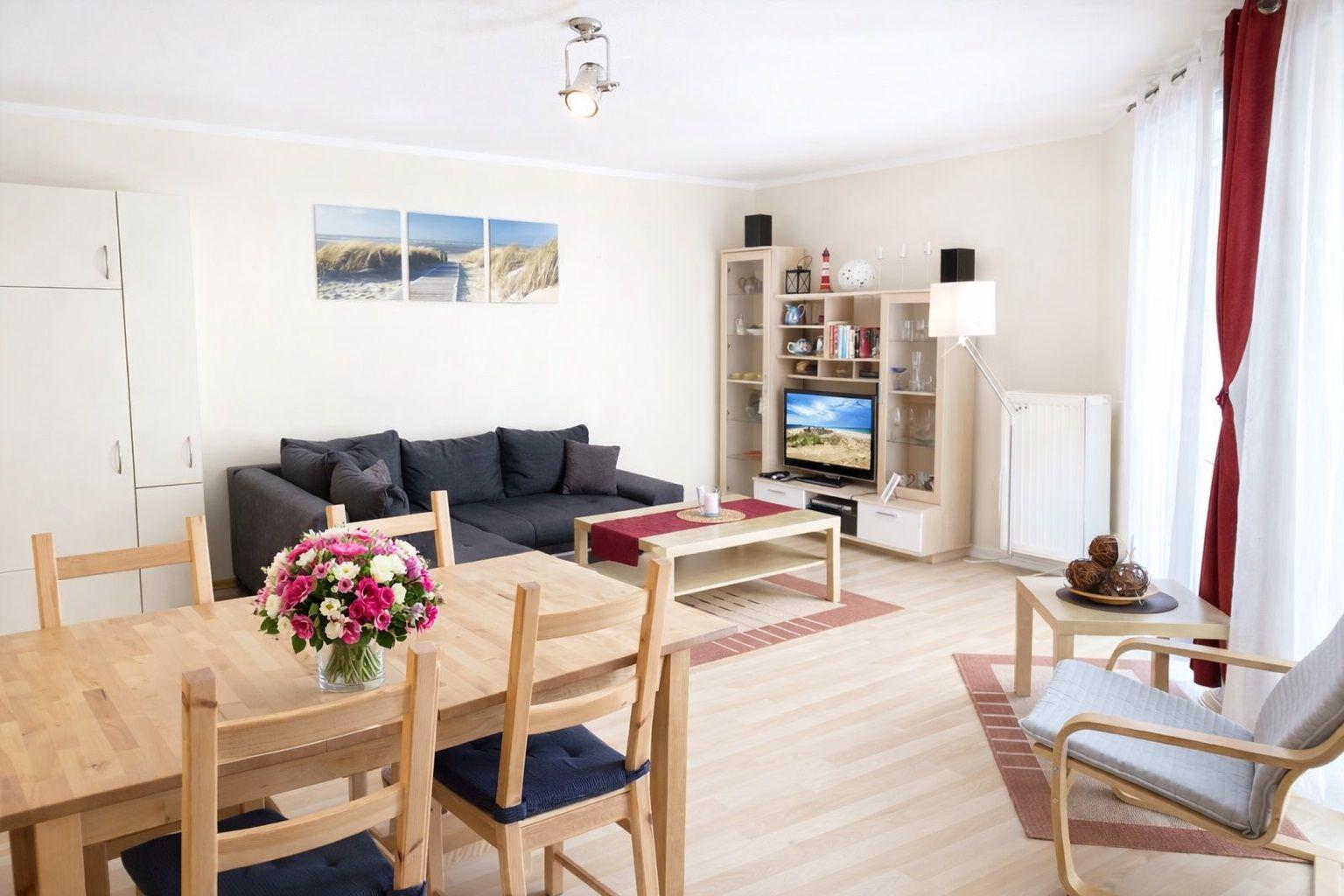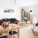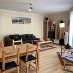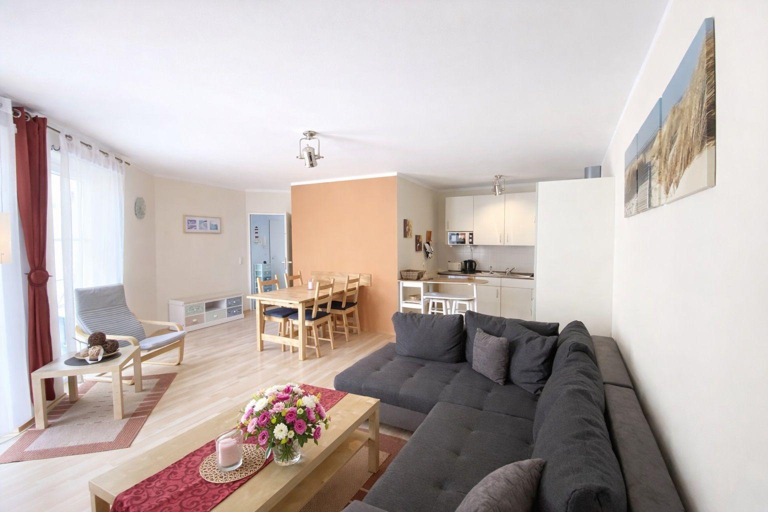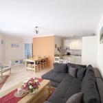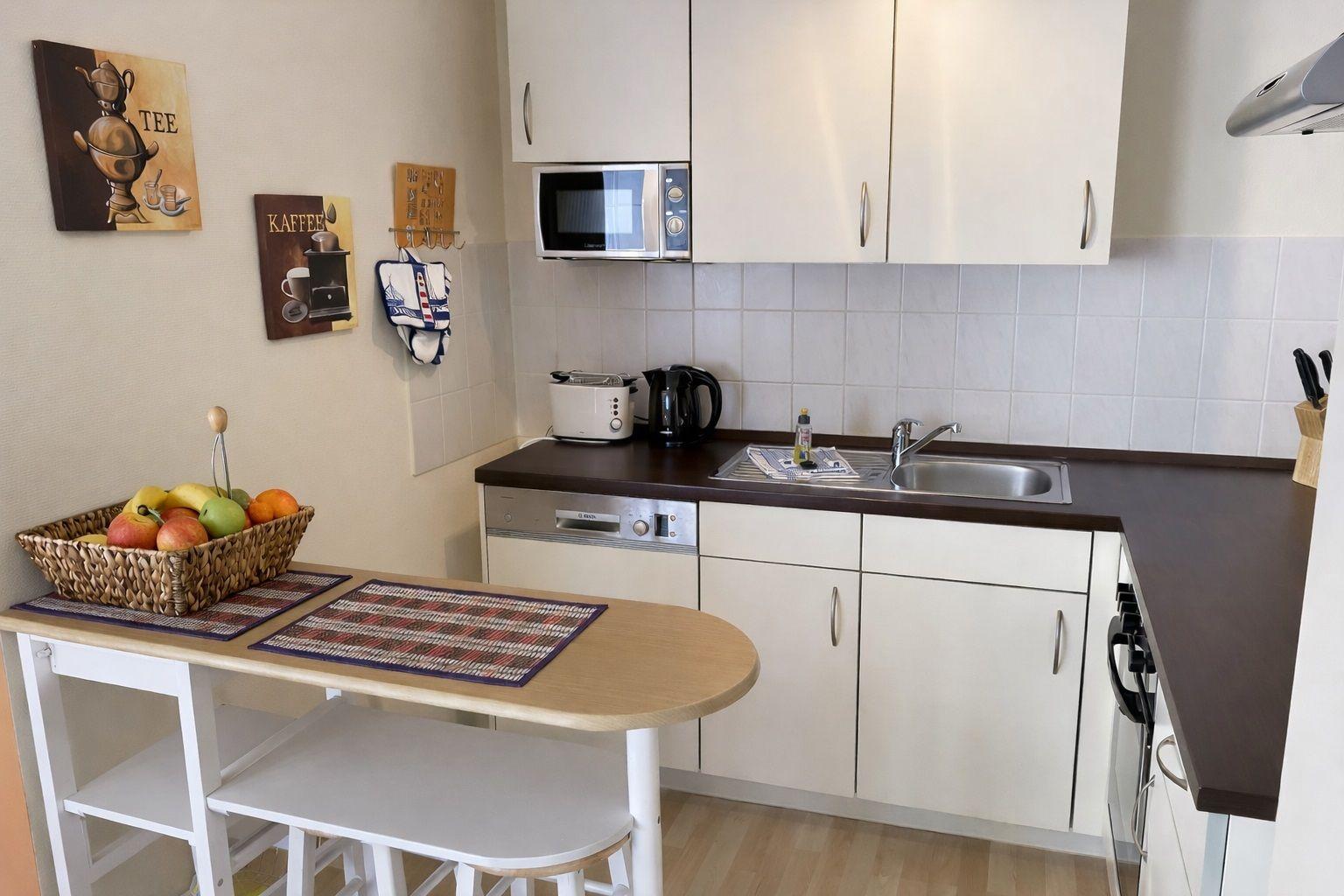 Die angrenzende Wohnküche ist komplett mit Ceranfeld, Backofen, Geschirrspüler und einer großen Kühl-Gefrierkombination ausgestattet. Selbstverständlich stehen auch sämtliche Haushaltsgeräte wie Toaster, Kaffeemaschine und Wasserkocher bereit.