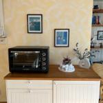 Die an den Wohnraum angrenzende Küche ist mit großem Esstisch, Geschirrspüler, Kühlschrank mit Gefrierfach, Handmixer, 2-Platten-Herd, Mikrowelle sowie einem kleinen Tischbackofen und allem, was Sie für die Selbstverpflegung benötigen, ausgestattet.