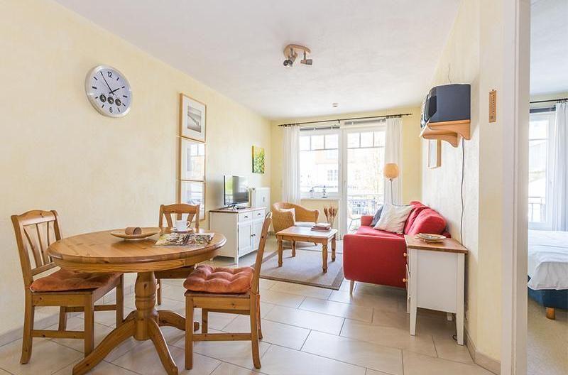 Die im nordischen Stil behaglich eingerichtete Zwei-Zimmer-Ferienwohnung empfängt bis zu zwei Urlauber auf 42 Quadratmetern. Das Ferienapartment liegt im ersten Stock des zweigeschossigen Gebäudes. Die Kombination von hellen Möbeln, den teilweise bodentiefen Fenstern (Terrassentür) sowie dem warmen Ton des sandfarbenen Fliesenbodens sorgt für eine entspannt-heimelige Atmosphäre von der ersten Minute an.