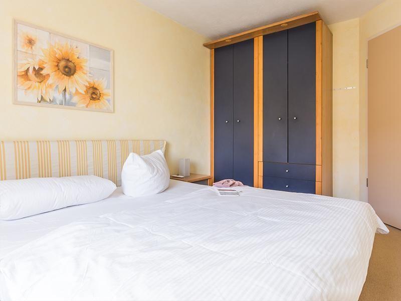 In dem in sanften Gelbtönen gehaltenen Schlafzimmer mit seiner beruhigenden Stimmung lässt es sich nach einem ereignisreichen Urlaubstag an der frischen Ostseeluft ganz vortrefflich schlafen dank zweier separater Matratzen (je 0,80 x 2,00 m). Es ist einfach an alles gedacht: Nachtschränkchen für die Urlaubslektüre, gemütliche Nachttischlampen, ein kleiner Fernseher und ein geräumiger Kleiderschrank mit vielen Schubladen für ausreichend Stauraum. Außerdem sorgt im Schlafzimmer ein weicher Teppich für ein wohliges Barfußgefühl. Mit Plissees und Vorhängen lassen sich sowohl das Schlaf- als auch das Wohnzimmer optimal verdunkeln.
