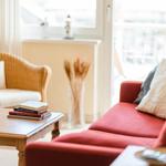 Gemütliche Fernseh- oder Leseabende verspricht das helle Wohnzimmer mit seiner gemütlichen roten Couch, dem wohnlichen Korbsessel, einem quadratischen Couchtisch und der TV-Kommode mit TV-Flachbildschirm. Am runden Essplatz sitzt man ganz bequem mit drei Personen.